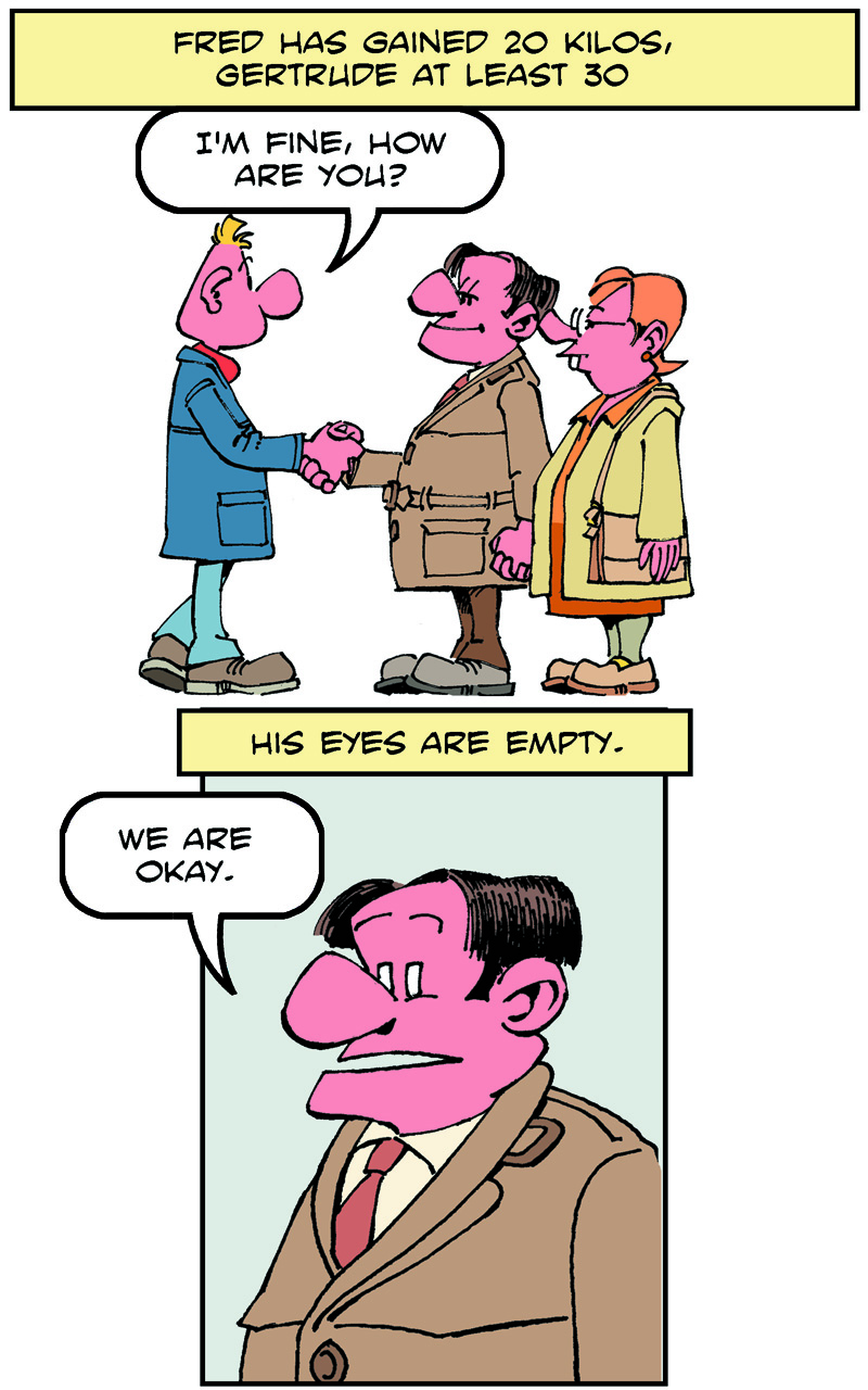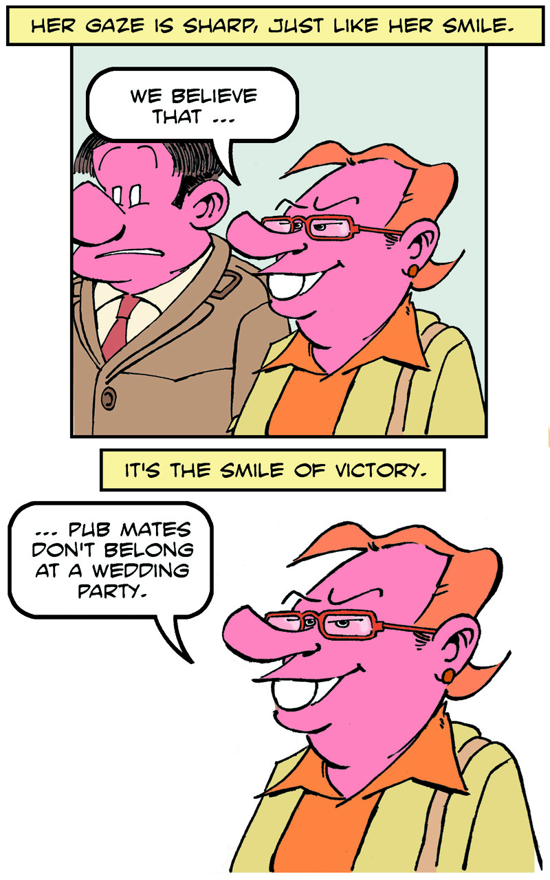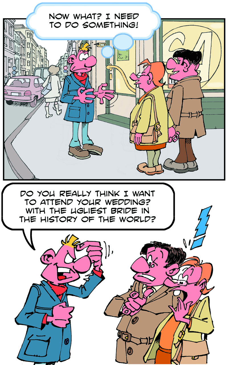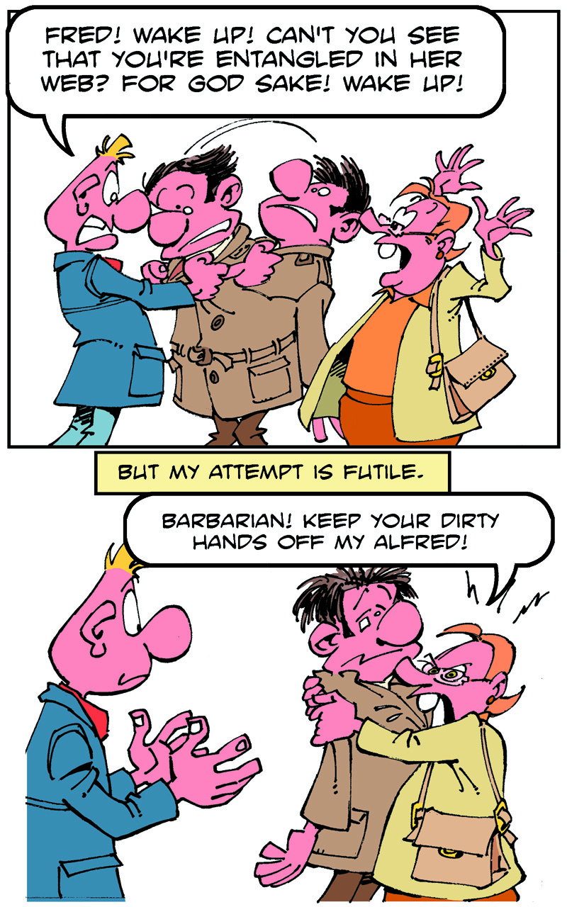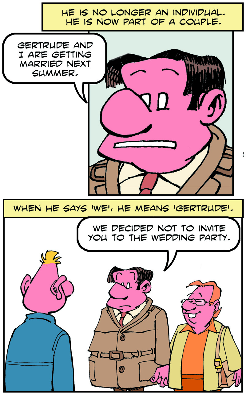 On the weekend, he goes to the pub to meet his friends, Fred and Stan.
