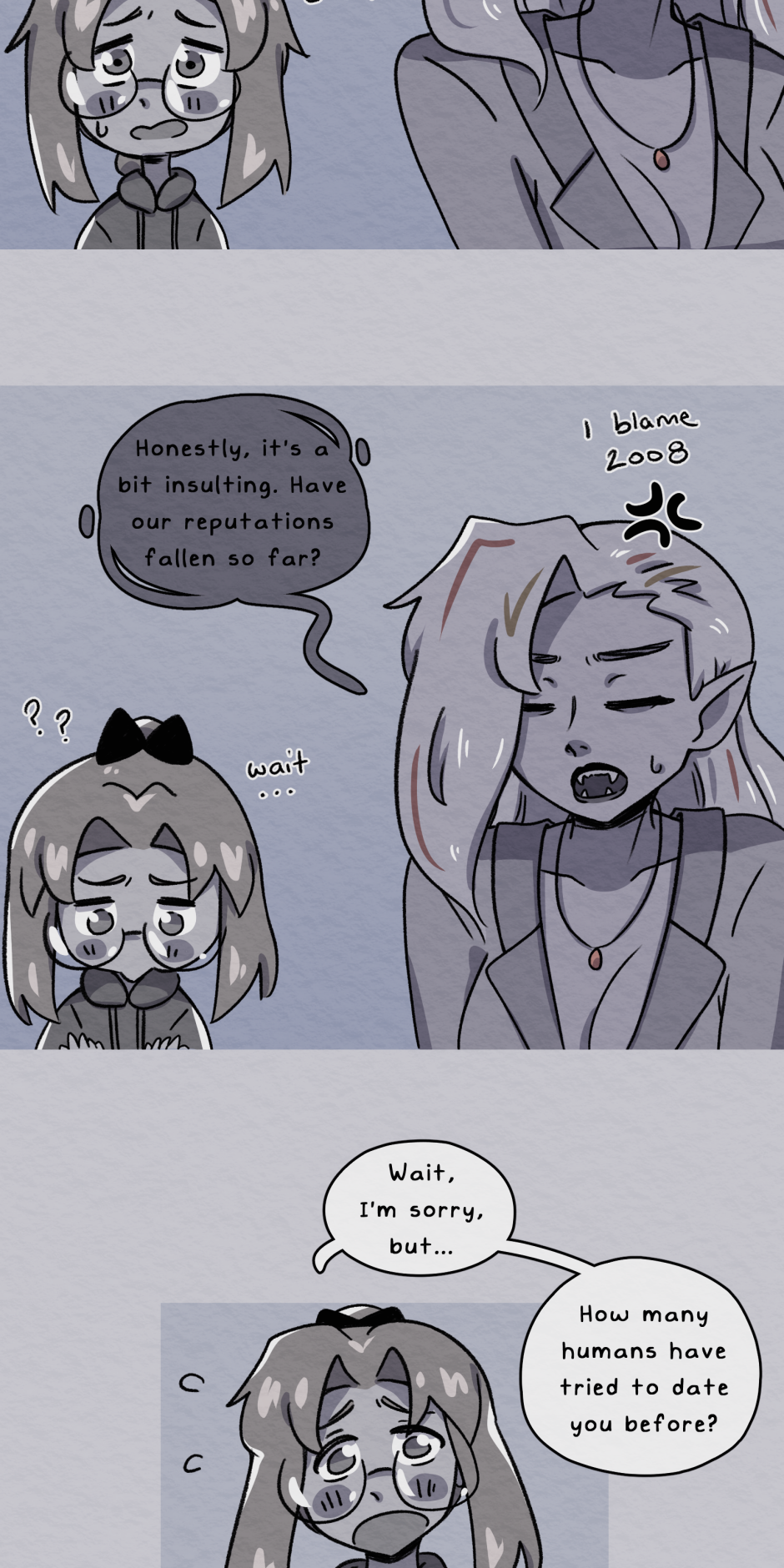 A human girl tries her best to court a pretty vampire lady she's never met before. Things seem to be going well, but not everything is as it appears. Updates every other Monday night.