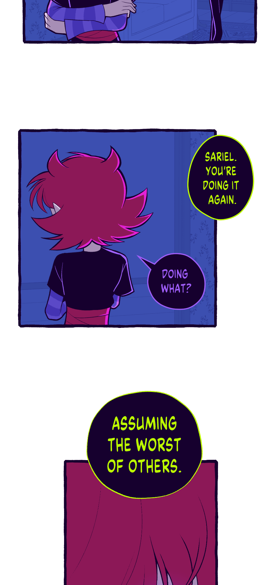 Also, does Sariel have horns? Or are those curved spikes on his head just his hair?
