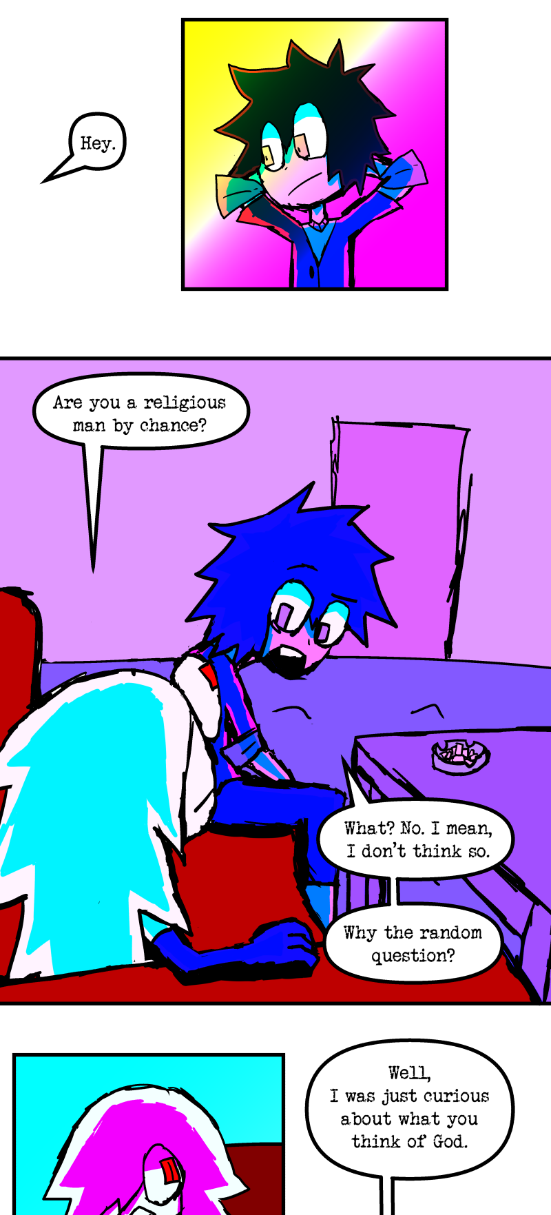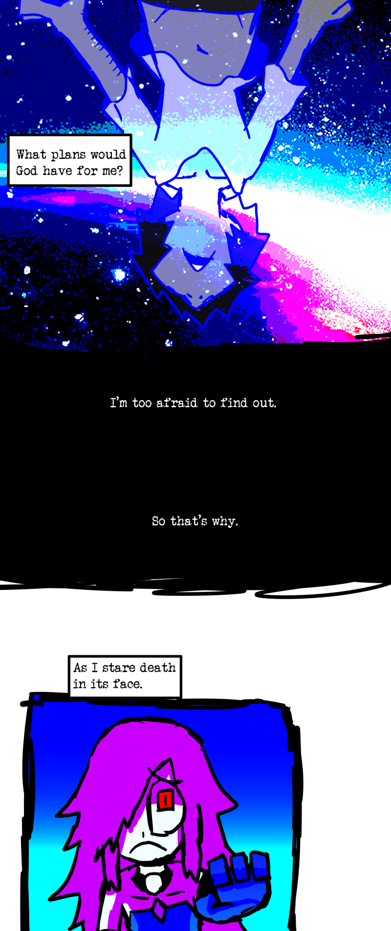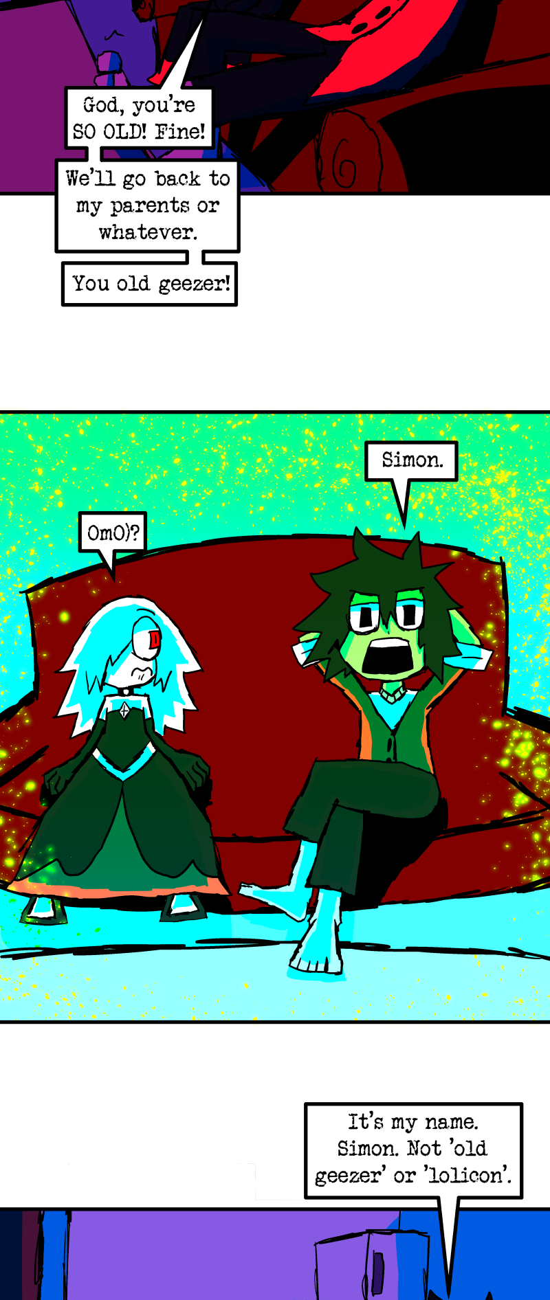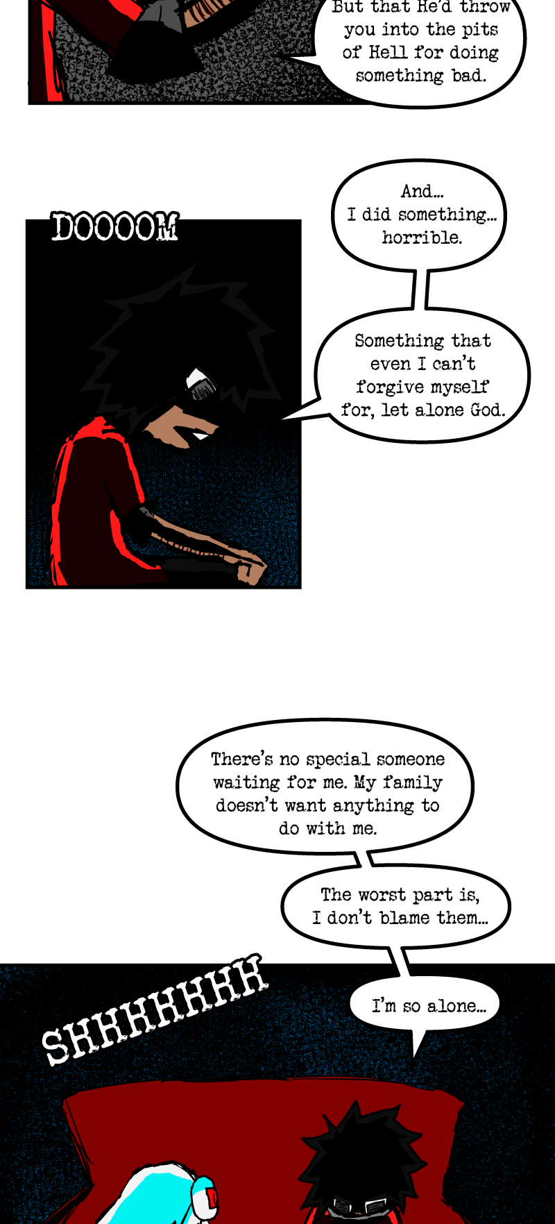 Simon is a 25-year-old, miserable alcoholic who hates himself for his past mistakes. His life takes a drastic turn when he is killed by a mysterious little girl who knocks on his door. He wakes up in a strange world where he must face his demons and is now set with the impossible task of killing God. Will he be able to overcome his guilt and defeat God? Find out in this psychedelic, highly saturated webcomic that explores themes of redemption, faith, and destiny!