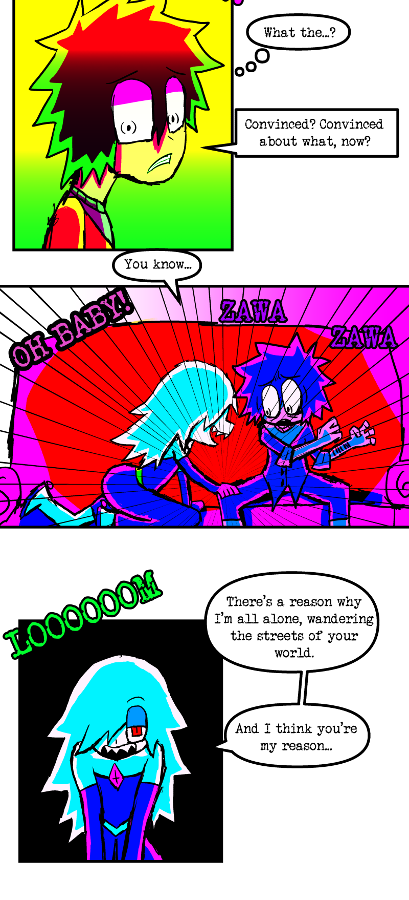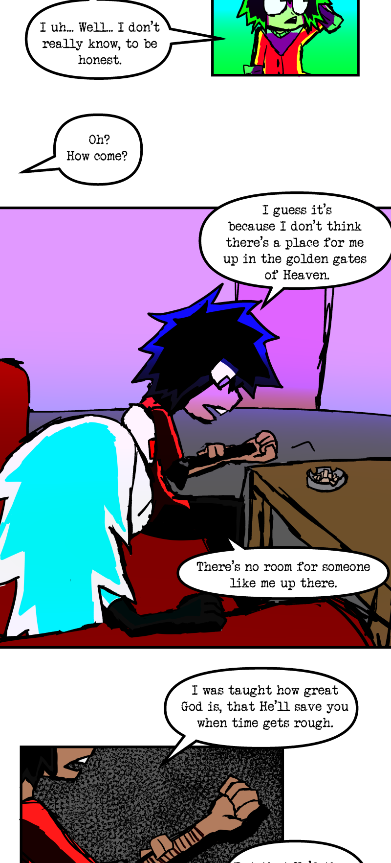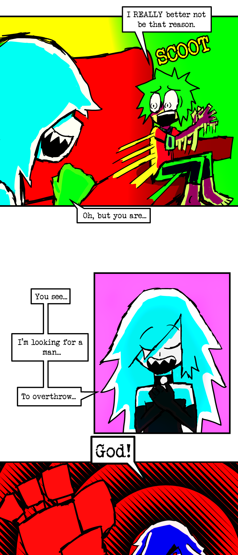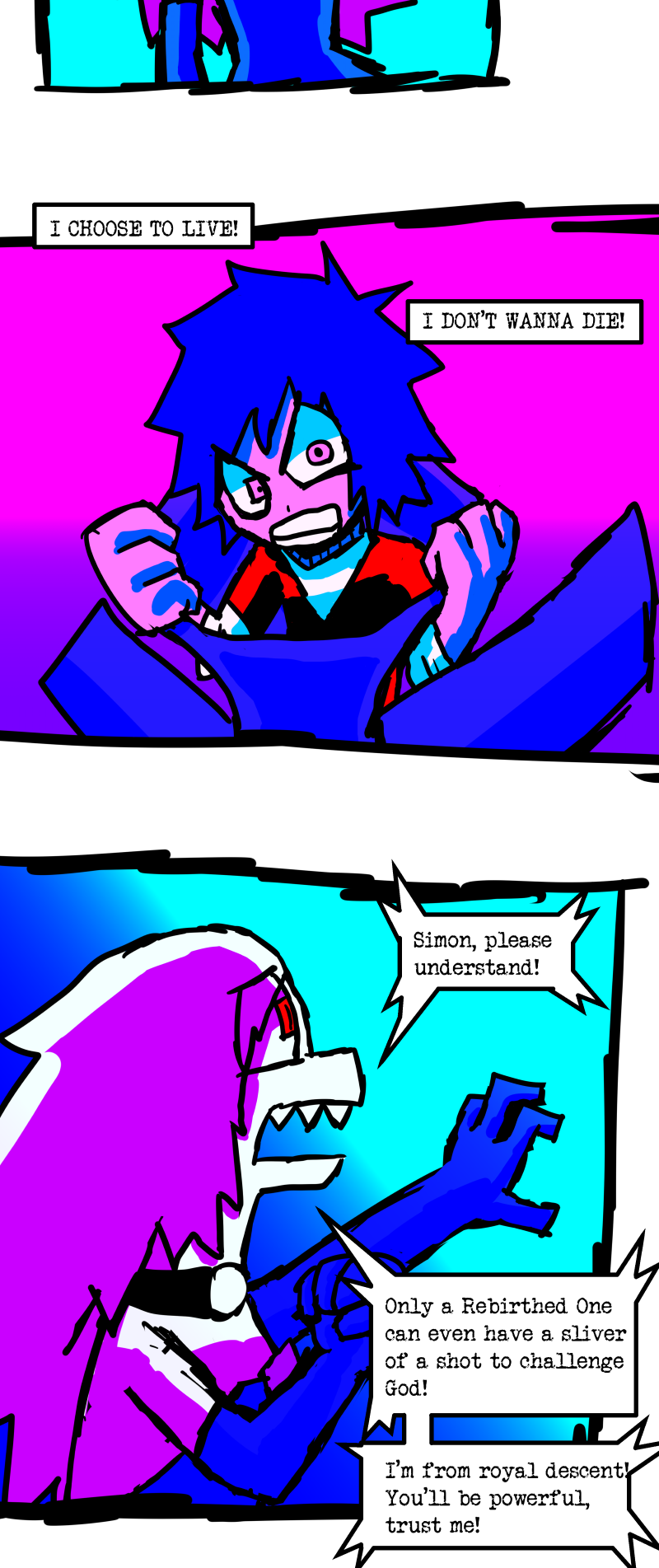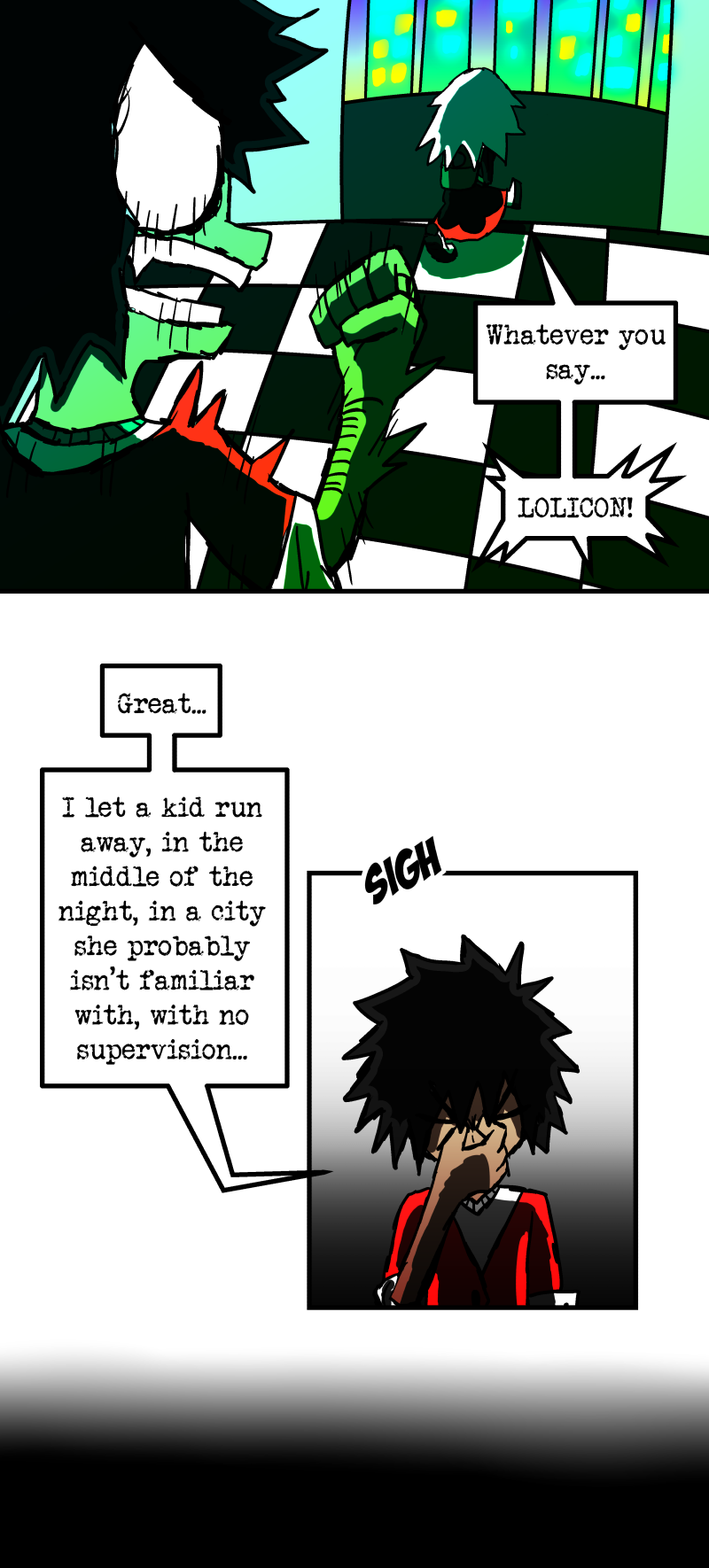 Simon is a 25-year-old, miserable alcoholic who hates himself for his past mistakes. His life takes a drastic turn when he is killed by a mysterious little girl who knocks on his door. He wakes up in a strange world where he must face his demons and is now set with the impossible task of killing God. Will he be able to overcome his guilt and defeat God? Find out in this psychedelic, highly saturated webcomic that explores themes of redemption, faith, and destiny!