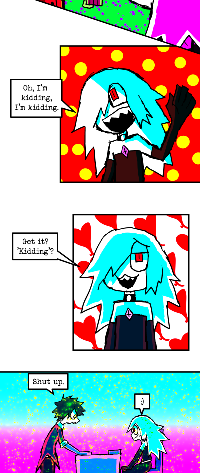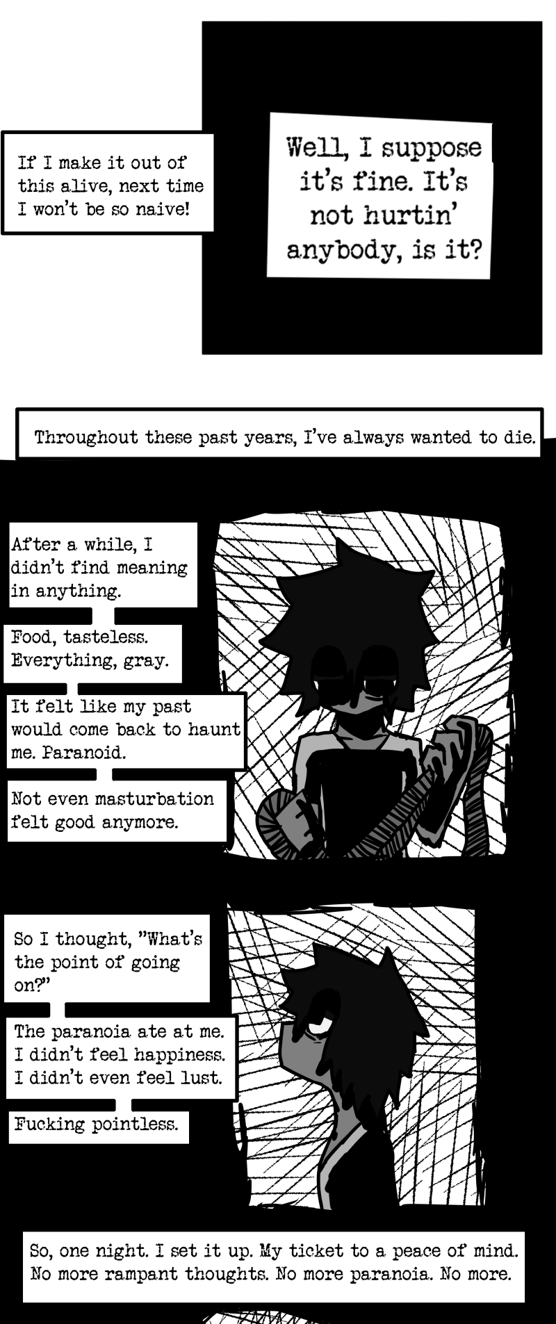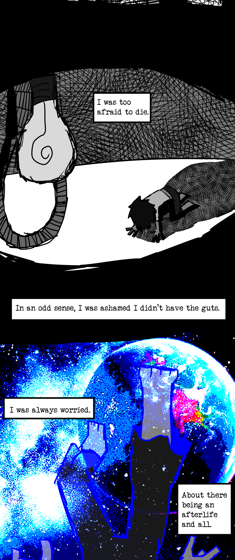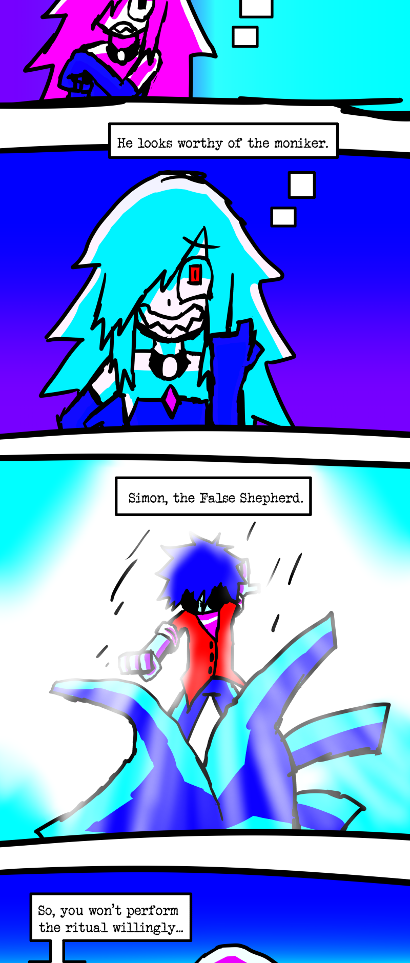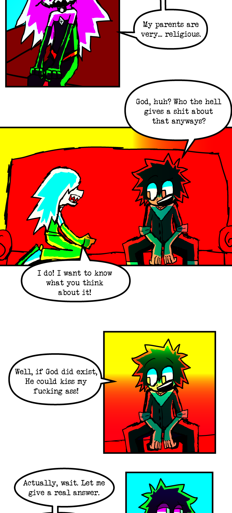 Simon is a 25-year-old, miserable alcoholic who hates himself for his past mistakes. His life takes a drastic turn when he is killed by a mysterious little girl who knocks on his door. He wakes up in a strange world where he must face his demons and is now set with the impossible task of killing God. Will he be able to overcome his guilt and defeat God? Find out in this psychedelic, highly saturated webcomic that explores themes of redemption, faith, and destiny!