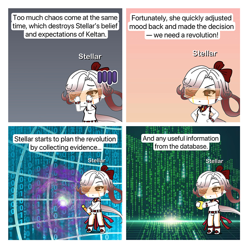 Disheartened by the actions of Keltan's high leaders, Stellar briefly lost her sense of purpose. Swiftly regaining her determination, she pivoted towards planning a revolutionary course of action to challenge the oppressive regime and forge a new path for cyber creatures.