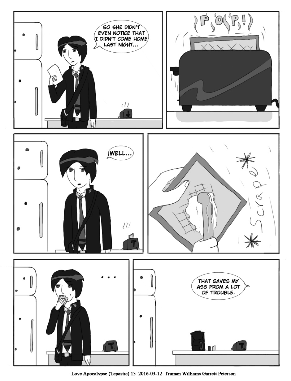 This is the first comic that I worked on, mainly doing the art while Truman wrote it. It released on Smackjeeves as [T&G’s] Love Apocalypse from May 7th 2013 to August 9th 2015, totaling in 63 pages, plus extras. The first page is being released on the main character’s birthday: February 28th.