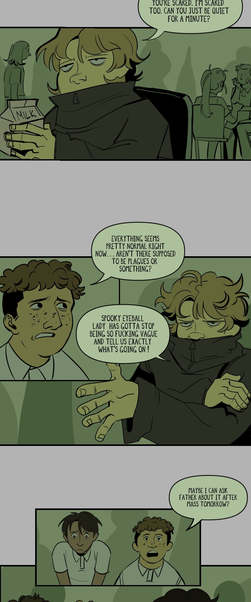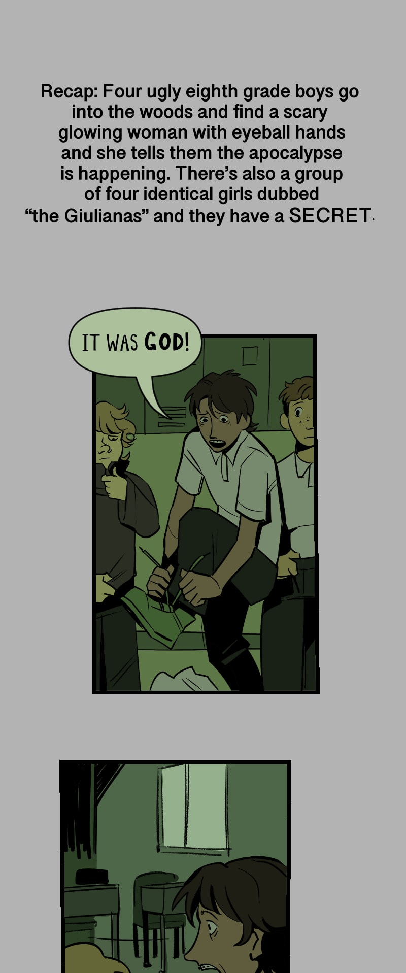 Nathan, Craig and Jeremy are three unsuspecting teen boys who are sick and tired of midwestern catholic school. In the midst of this, biblical apocalypse commences in preparation for the final battle between two major entities. Their eighth grade year slowly descends into madness once they find out that they must rebuild god before the devil destroys the universe.