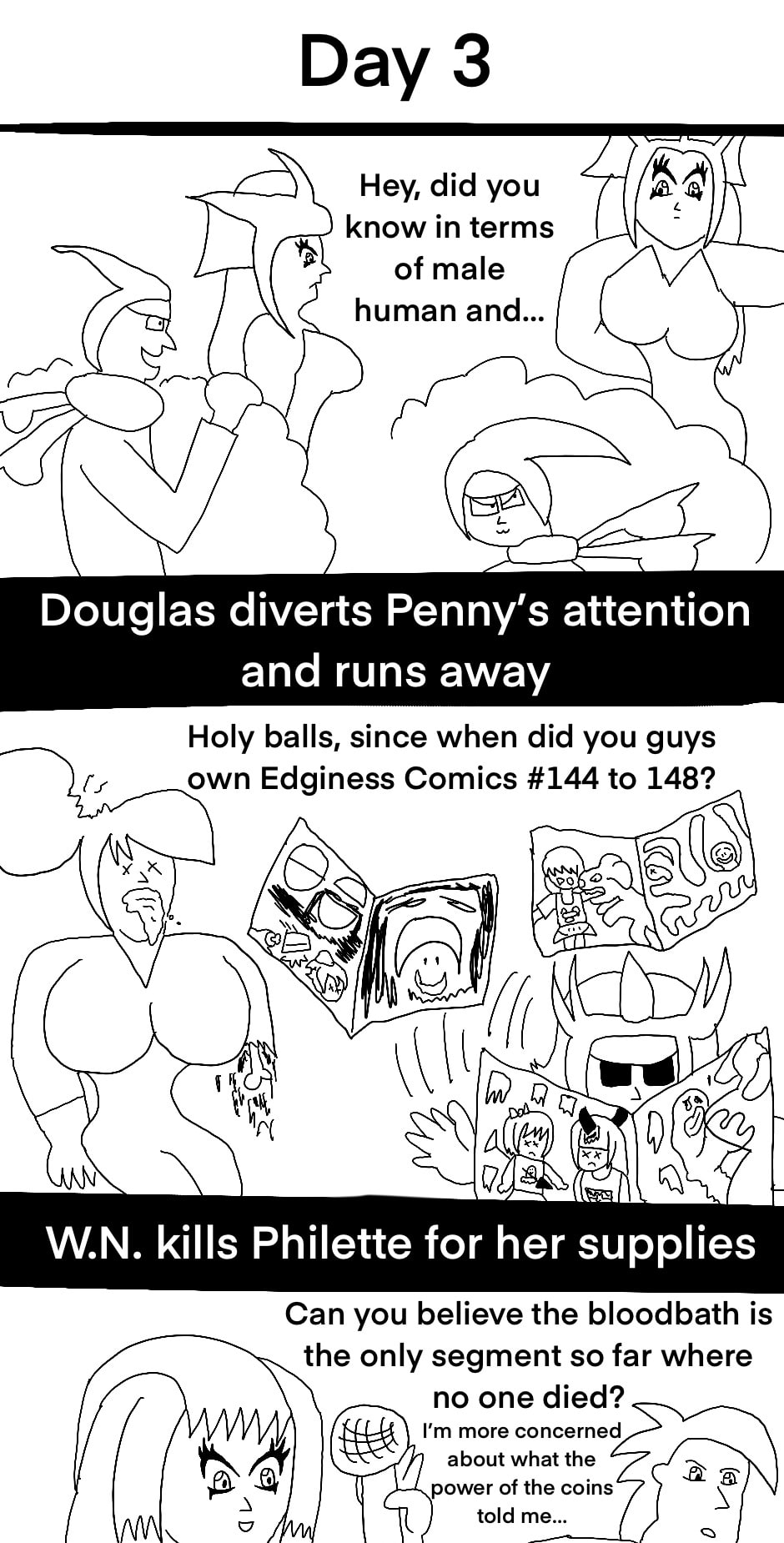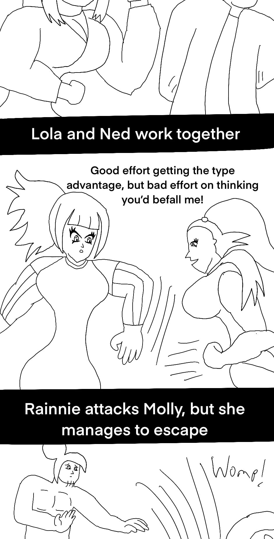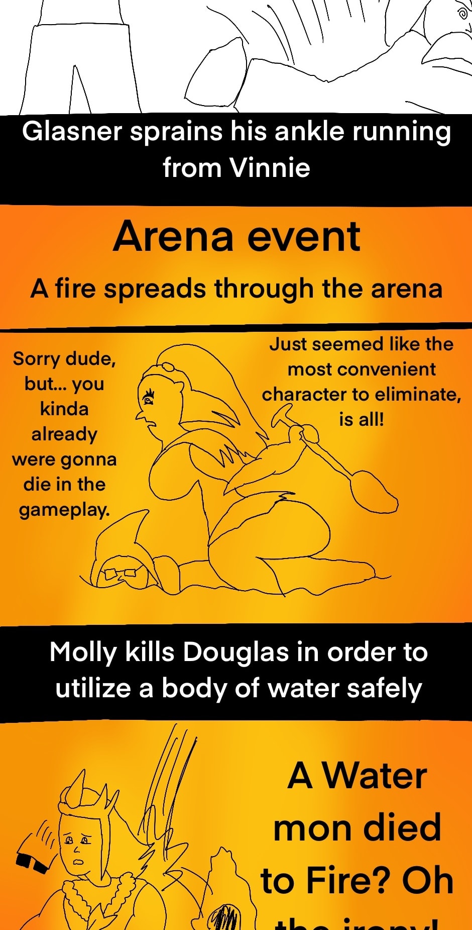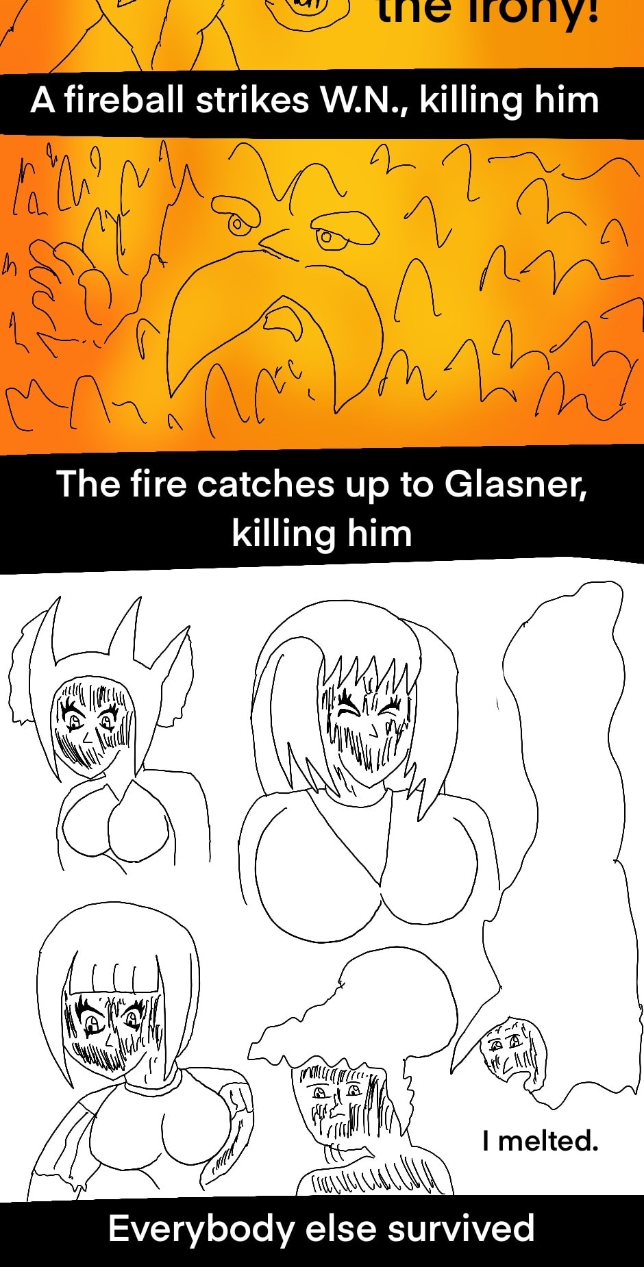 Yes, the dude based on a mon made of gold melted to the heat. And after doing nothing for the first few rounds, W.N. proceeded to kill off someone in each segment til his death. And yet another thing I changed from the original simulator where it was actually her kicking him into the fire, but that seemed impossible to really illustrate and the way they worded it made it seem as if both died. I don’t know maybe I should try drawing a deleted scene of that.