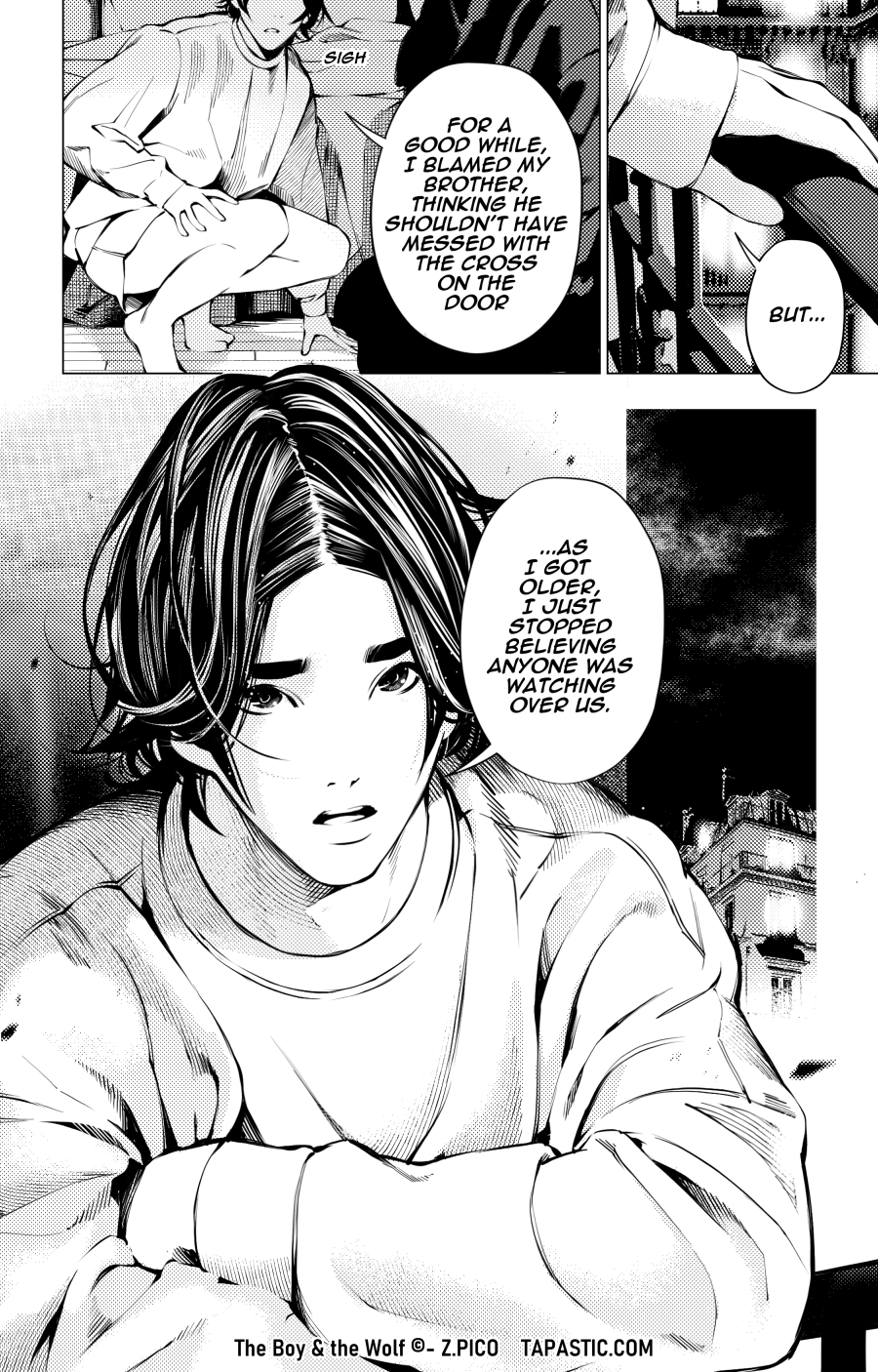 For instance, we understand how the influence of his grandmother and her religious teachings contributed to his understanding of the incident. He was just a child who had been told that a cross was a symbol of protection. And when his brother erased that cross, he immediately thought that God had punished them for it. I found it interesting to have a character who fears the potential existence of God. Typically, people either believe or don't.