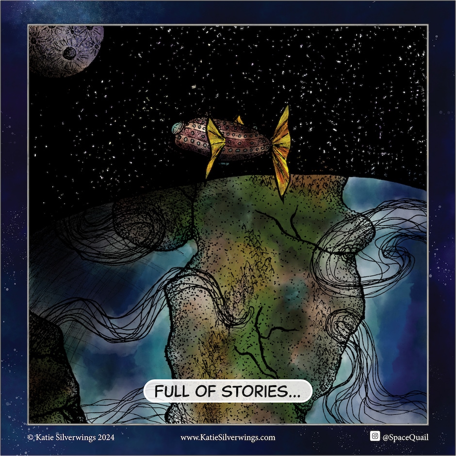 You can also find Space Quail on the official @SpaceQuail Instagram account and on my website. The comic will be updating sporadically for the time being, as my characters have a lot of other book and art projects in the works for 2024. If Captain Coturnix and company get a good amount of attention this year, I will be able to dedicate a larger portion of my creating time to them going forward.