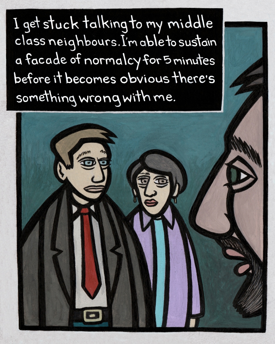 I get stuck talking to my middle class neighbours. I'm able to sustain a facade of normalcy for 5 minutes before it becomes obvious there's something wrong with me.