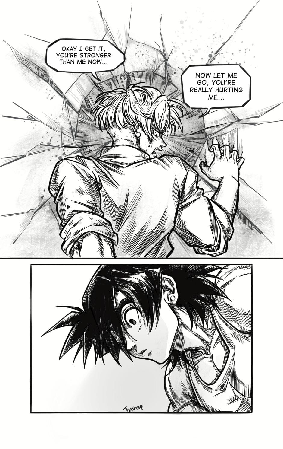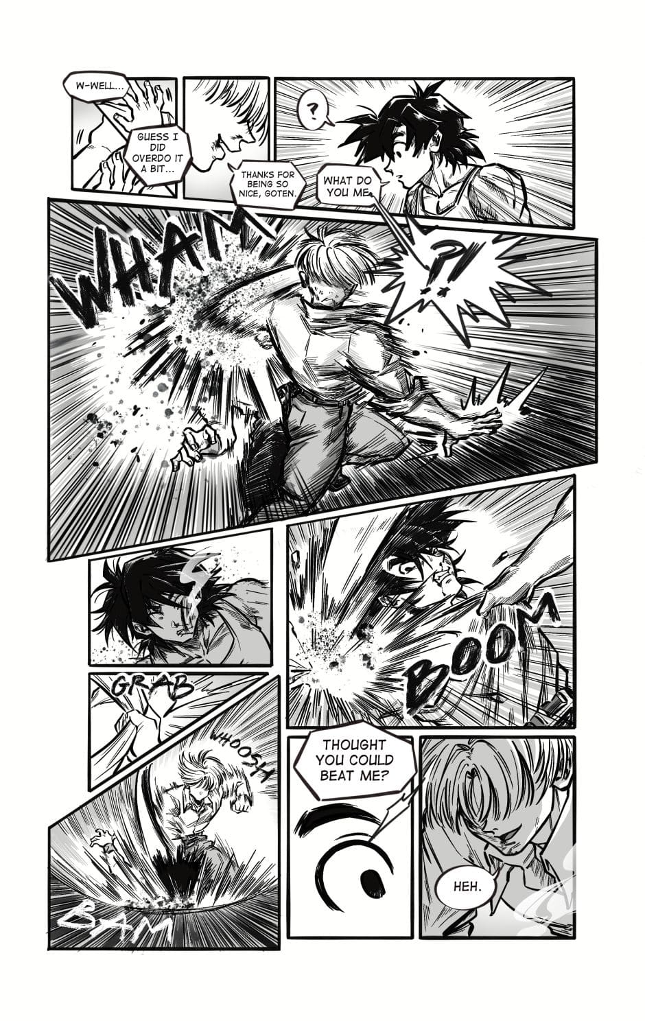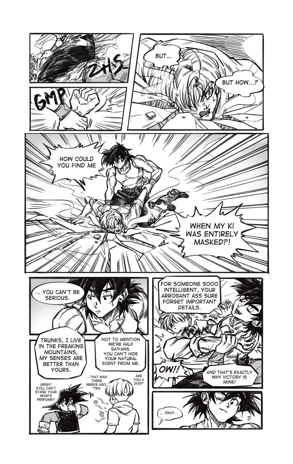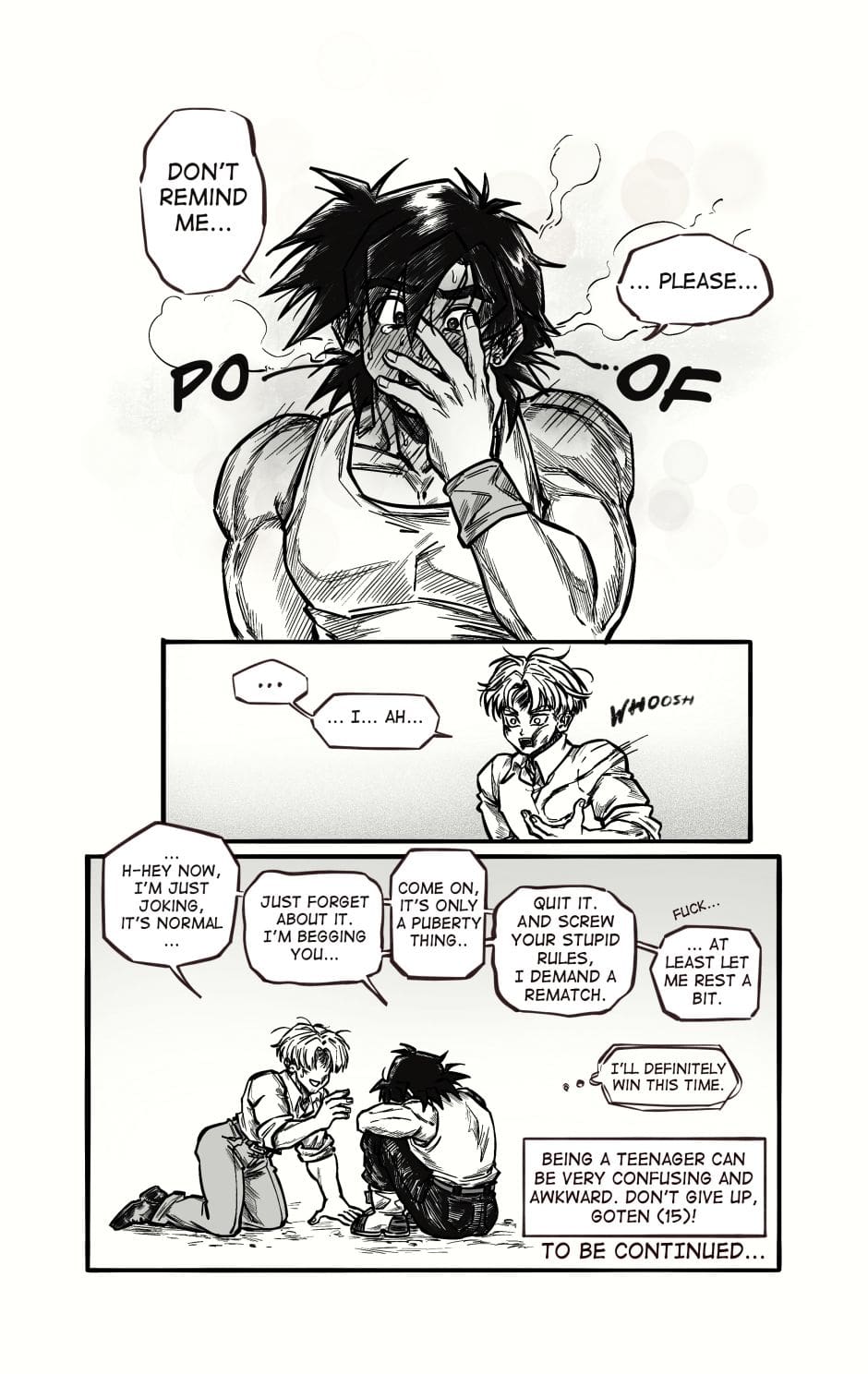 ToT trunksssss why are you so stupid!!! its awkward alr dont point it out!!! aaaaaaa goten cheeky face when hes got trunks pressed on the floor is so cute and !!! your action lines and the movement!!! its so gorgeous i love your style sm and their dialogue flows so well hehhe please forigve me for only commenting on this chapter kah!!
