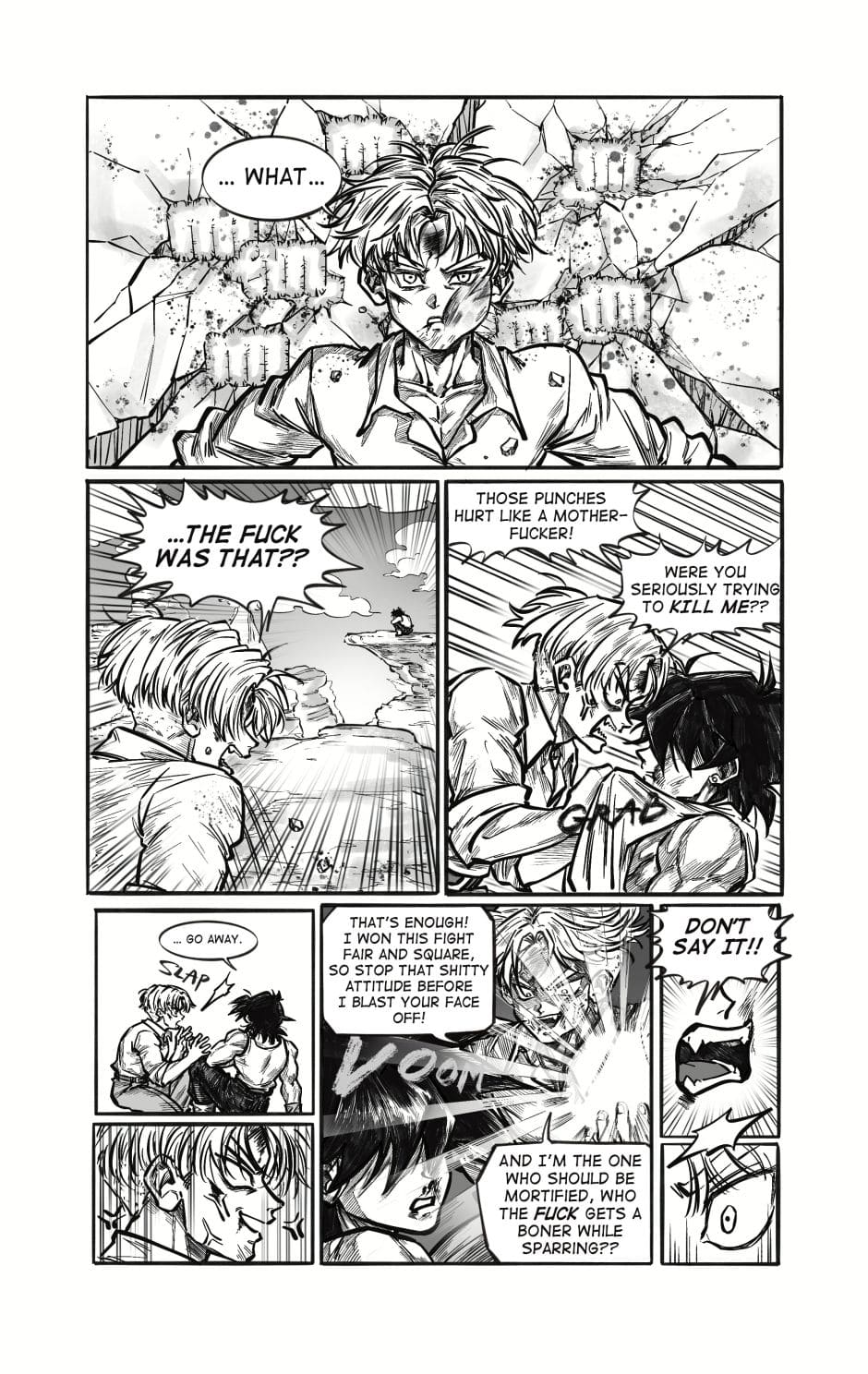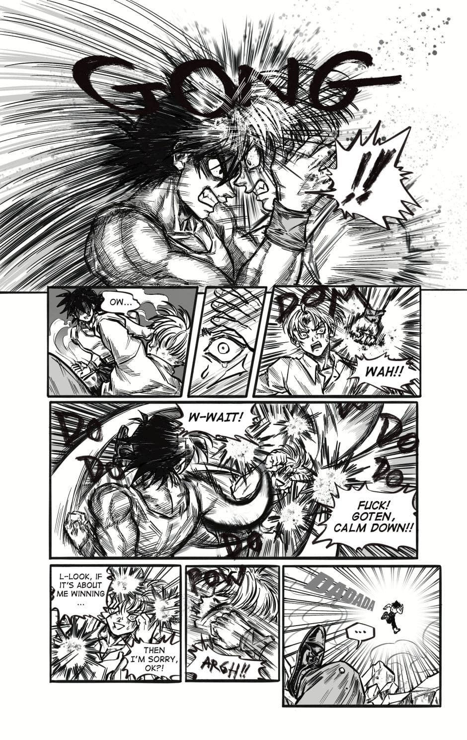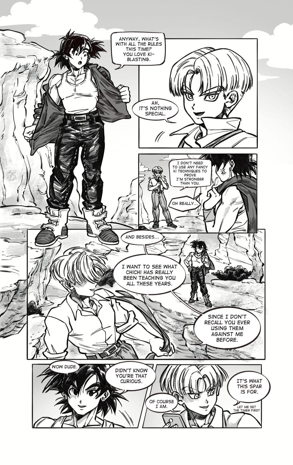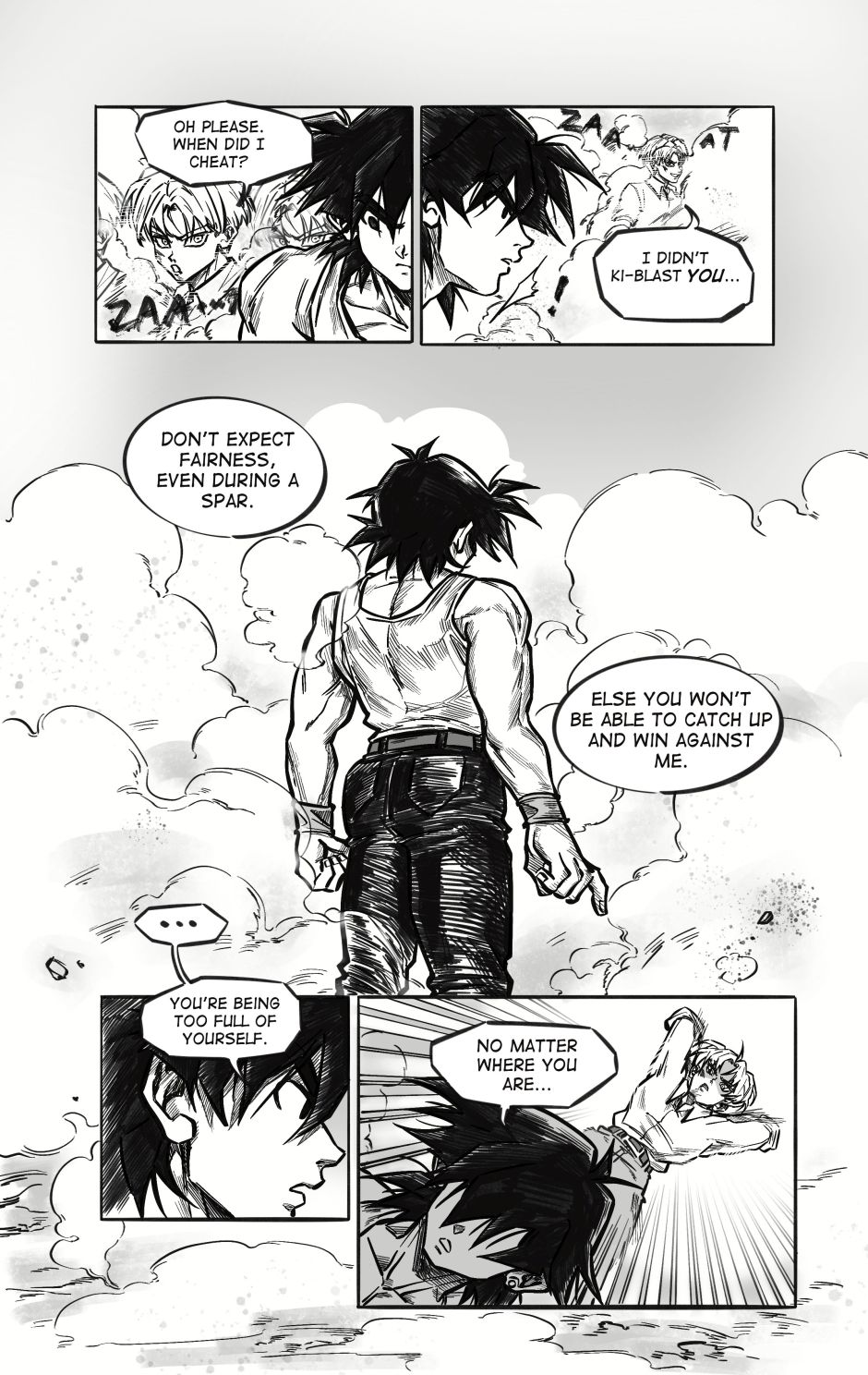 ToT trunksssss why are you so stupid!!! its awkward alr dont point it out!!! aaaaaaa goten cheeky face when hes got trunks pressed on the floor is so cute and !!! your action lines and the movement!!! its so gorgeous i love your style sm and their dialogue flows so well hehhe please forigve me for only commenting on this chapter kah!!