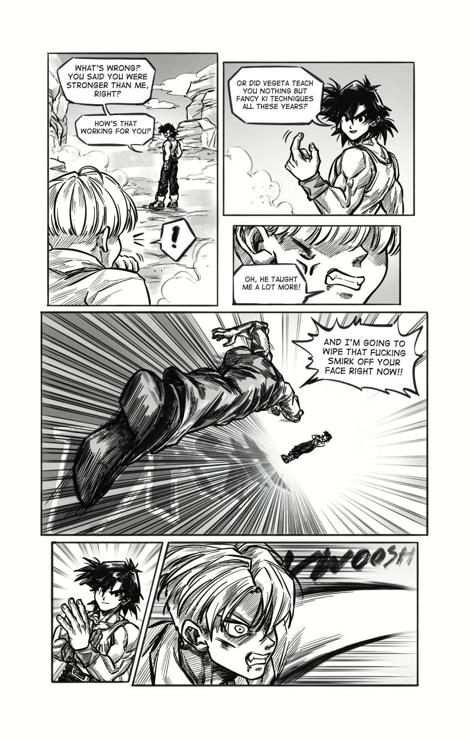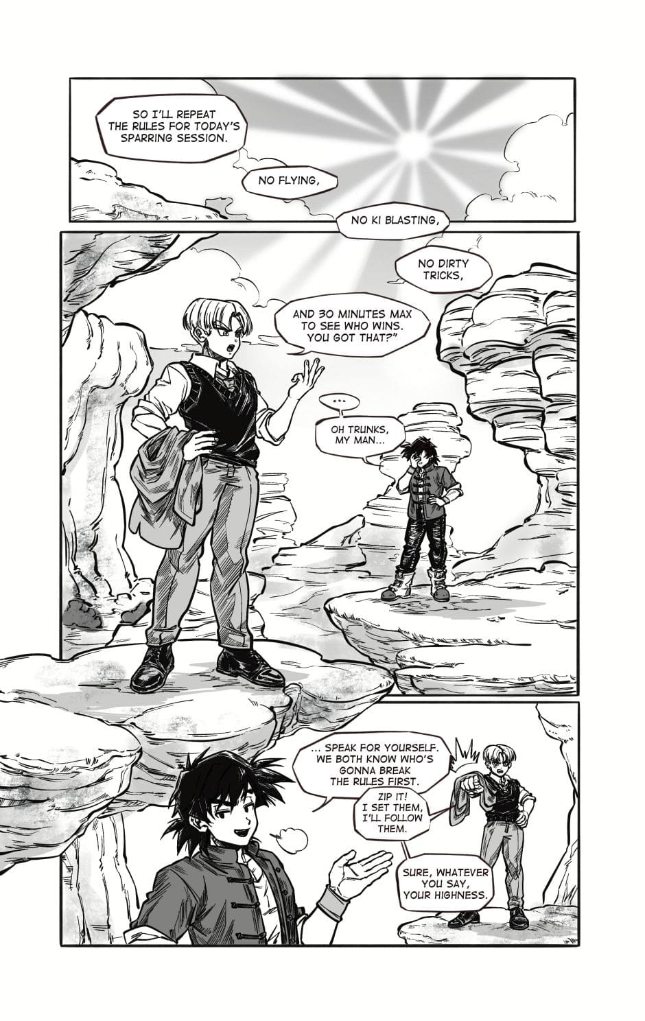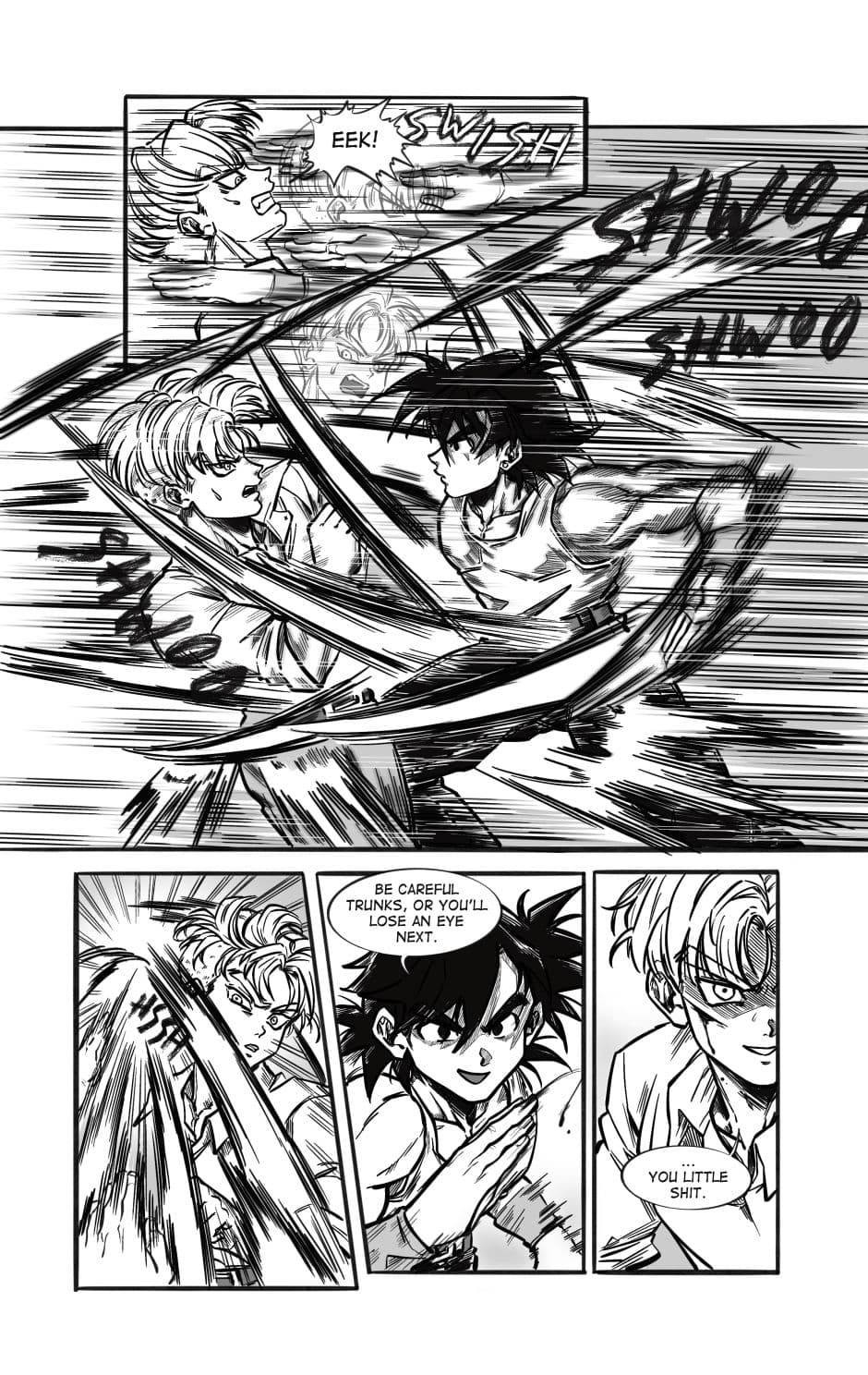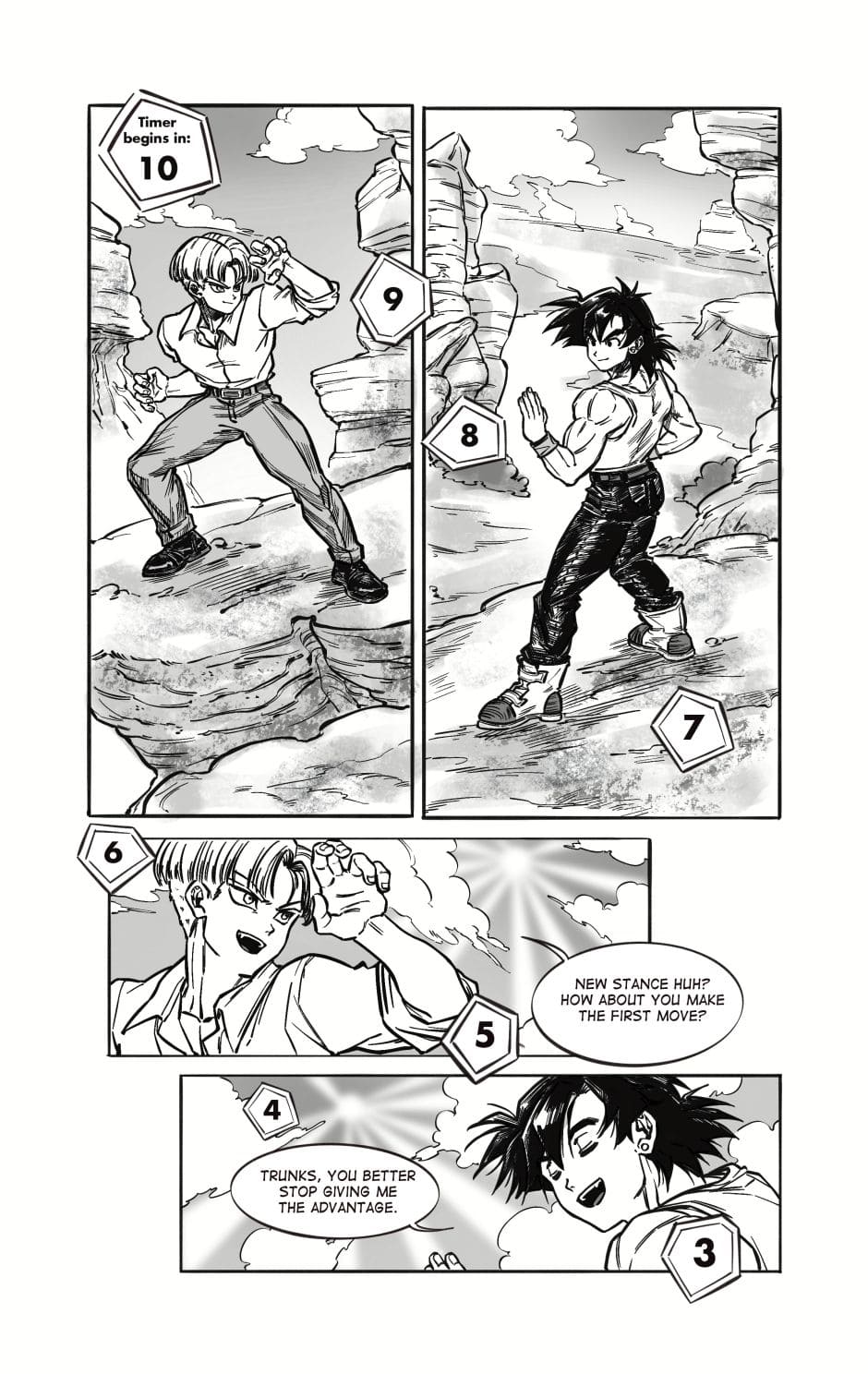 ToT trunksssss why are you so stupid!!! its awkward alr dont point it out!!! aaaaaaa goten cheeky face when hes got trunks pressed on the floor is so cute and !!! your action lines and the movement!!! its so gorgeous i love your style sm and their dialogue flows so well hehhe please forigve me for only commenting on this chapter kah!!