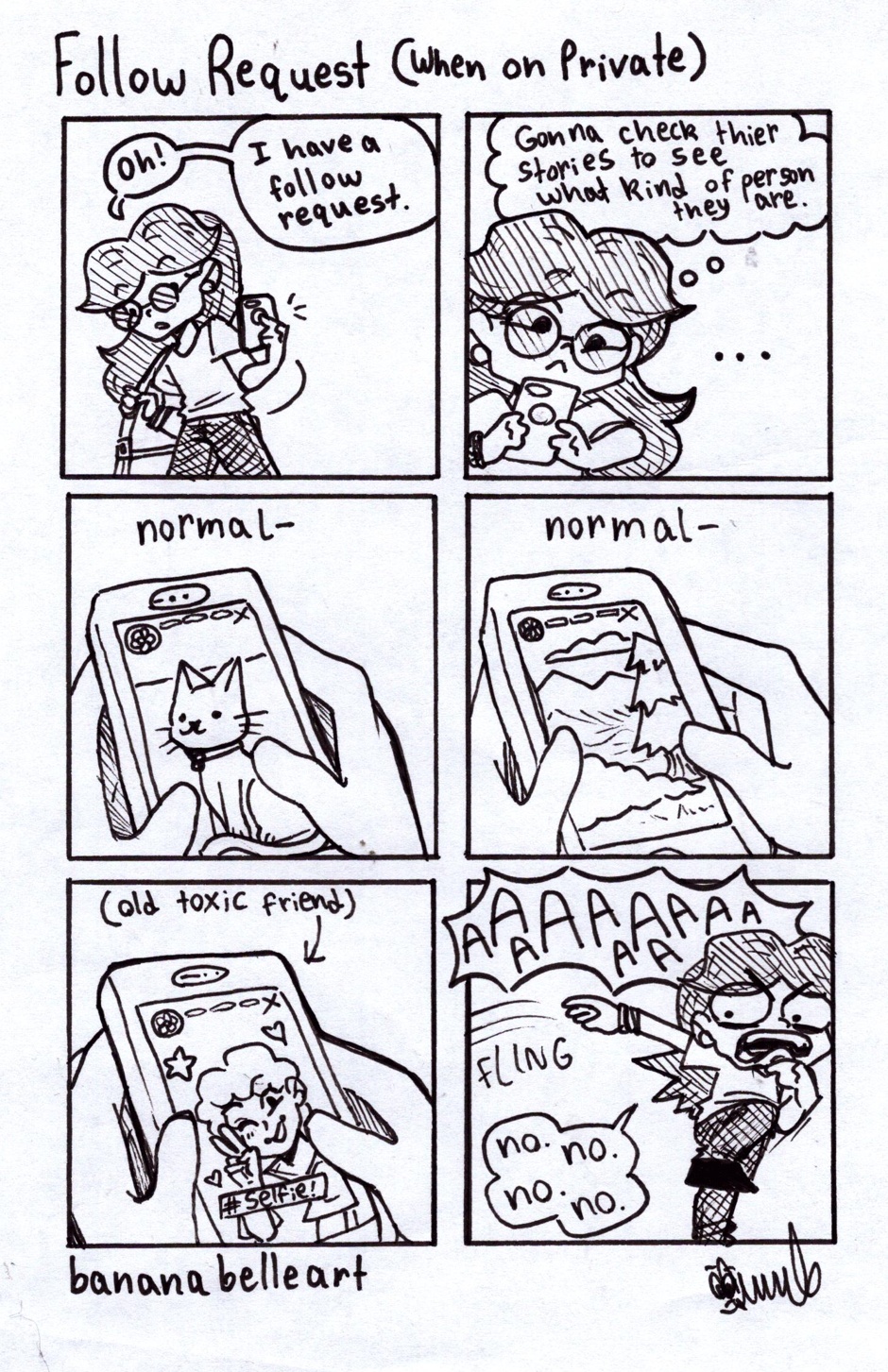Side note, someone commented that me categorizing people as normal or not is rude, which I agree with, I'm sorry for putting that in this comic, when I check someone's stories I'm more checking that they don't like show themselves breaking laws or being mean or something, it's less of me checking if they are 'normal', and more checking to make sure they aren't going to make me uncomfortable. I don't mean to call anyone abnormal 😓