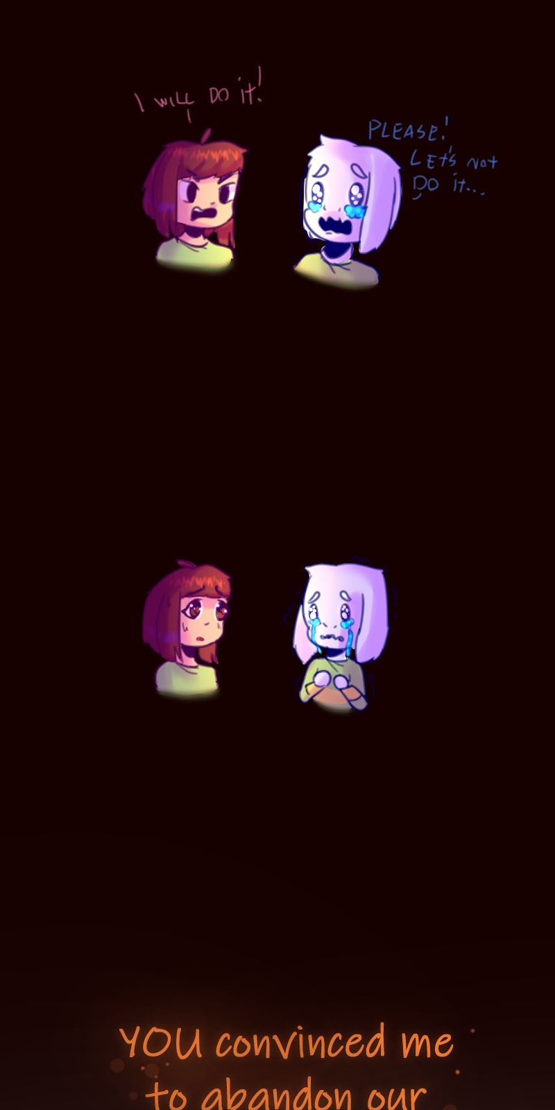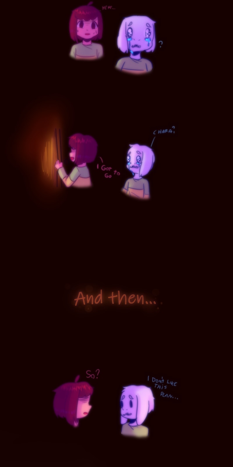 This is an alternate universe of undertale where Chara and Asriel abandoned their original plan which set stone every event in the original game. And so after not going through their plan, some years later on a faithful day, Chara and Asriel find another fallen human, but things take a dark turn and the 2 siblings will have to carry on with a big secret. Will anyone find out or will they be able to carry out a new plan?