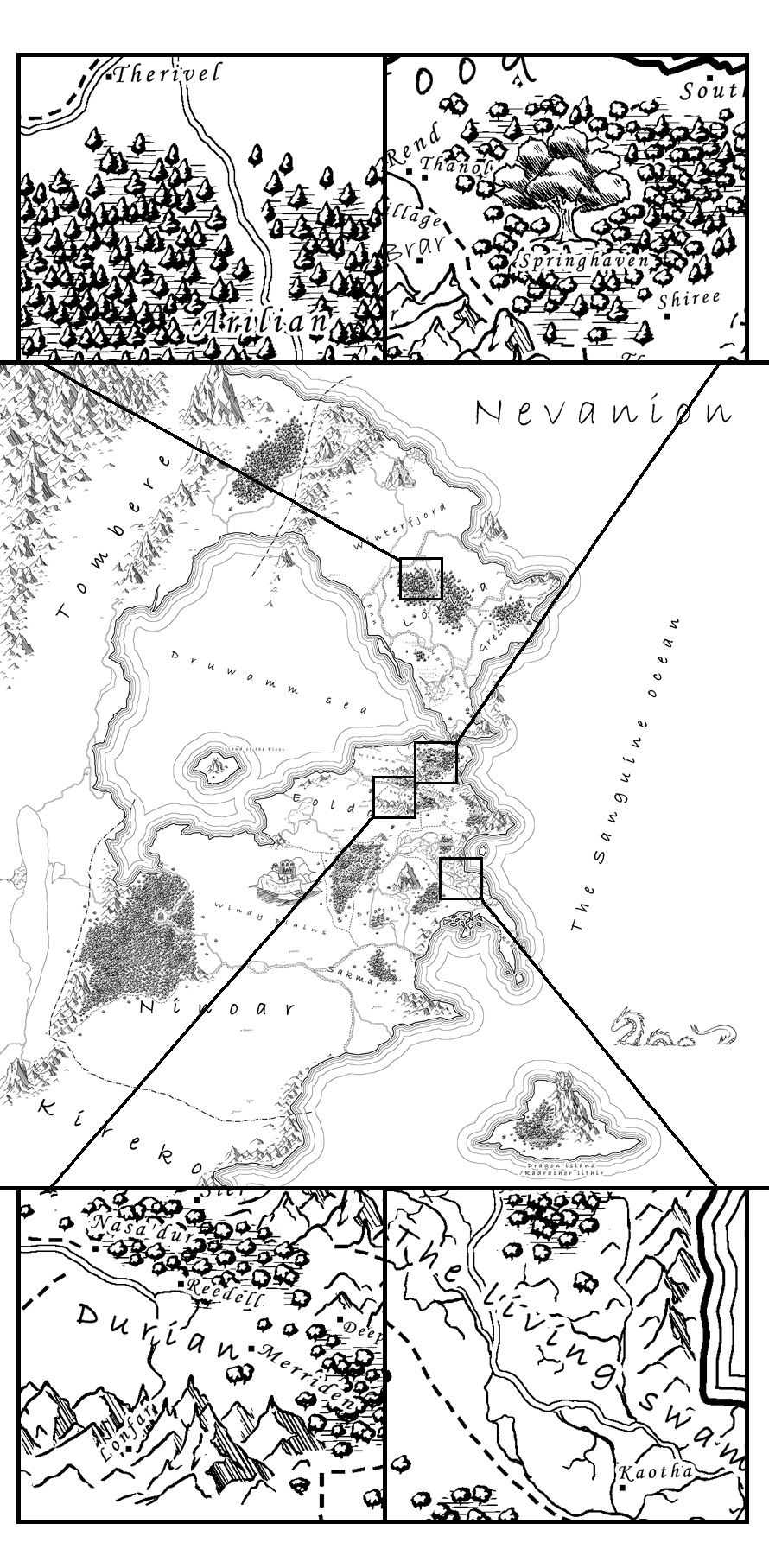 The map over Nevanion with all the cities and area names. I know it's kinda hart to see all the small details (the full resolution is 9000x10000 pix) for the moment this size will only be available on Patreon (www.patreon.com/TLA) but wanted to give you guys a quick overlook ^^