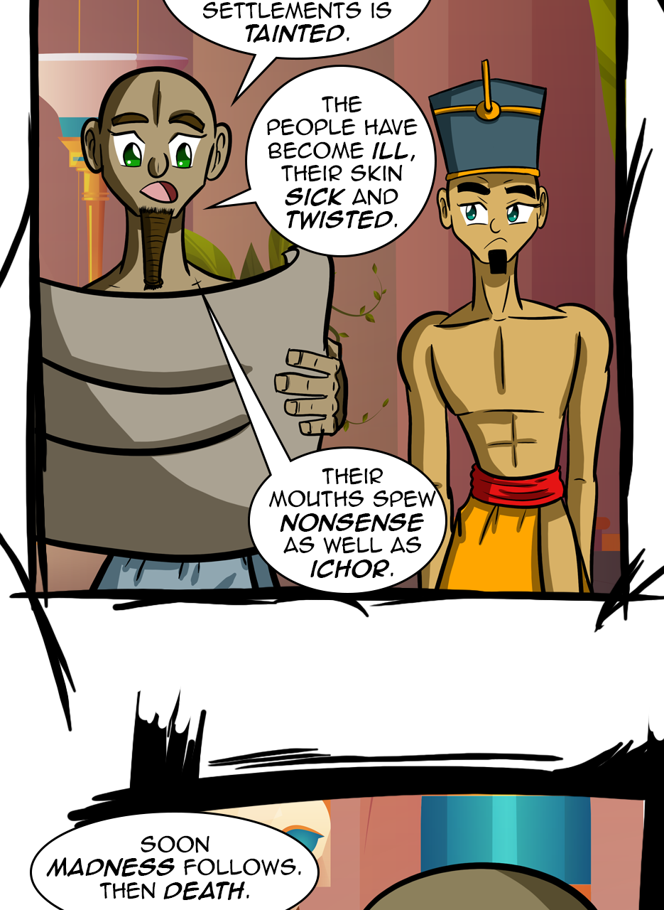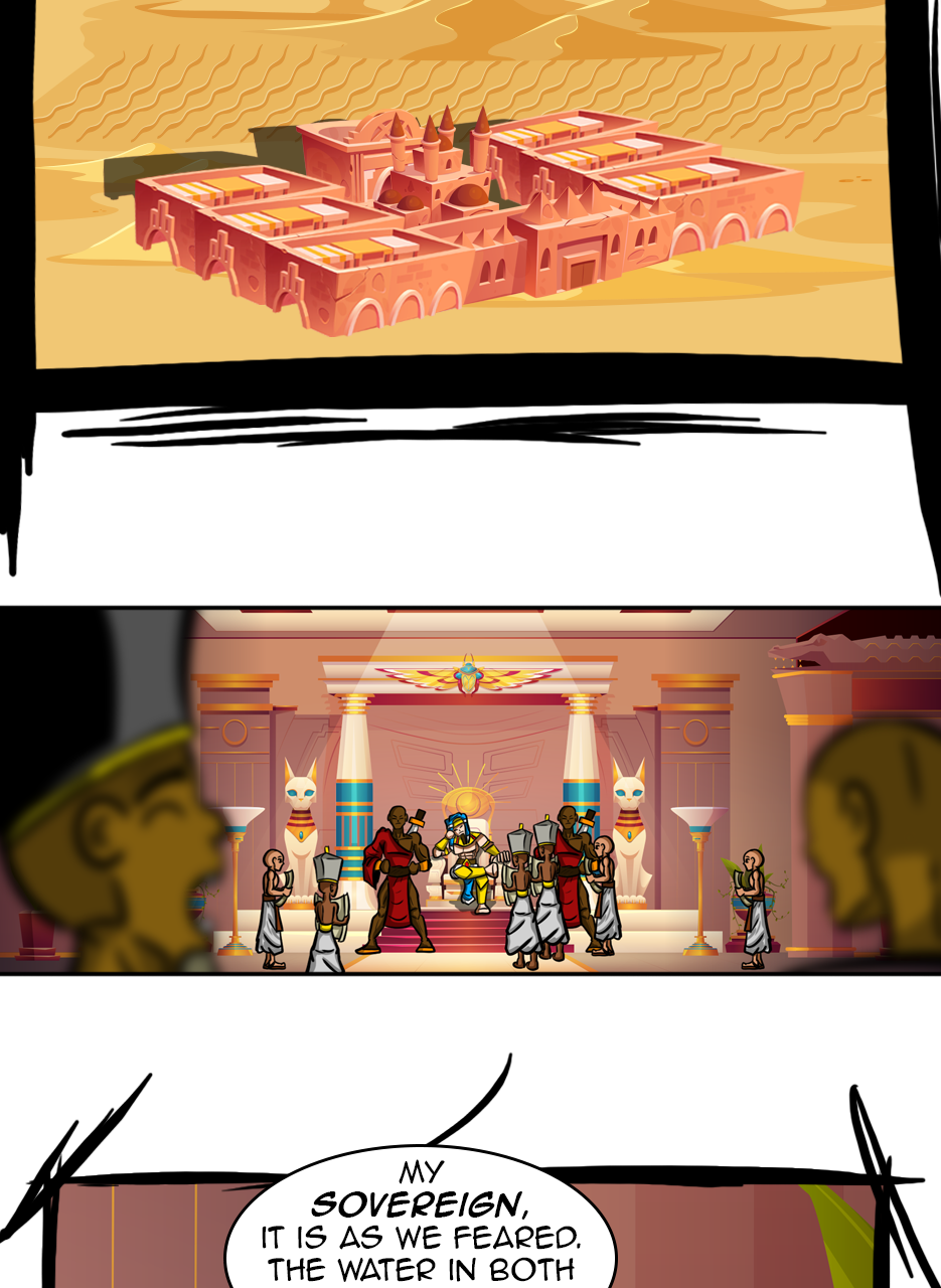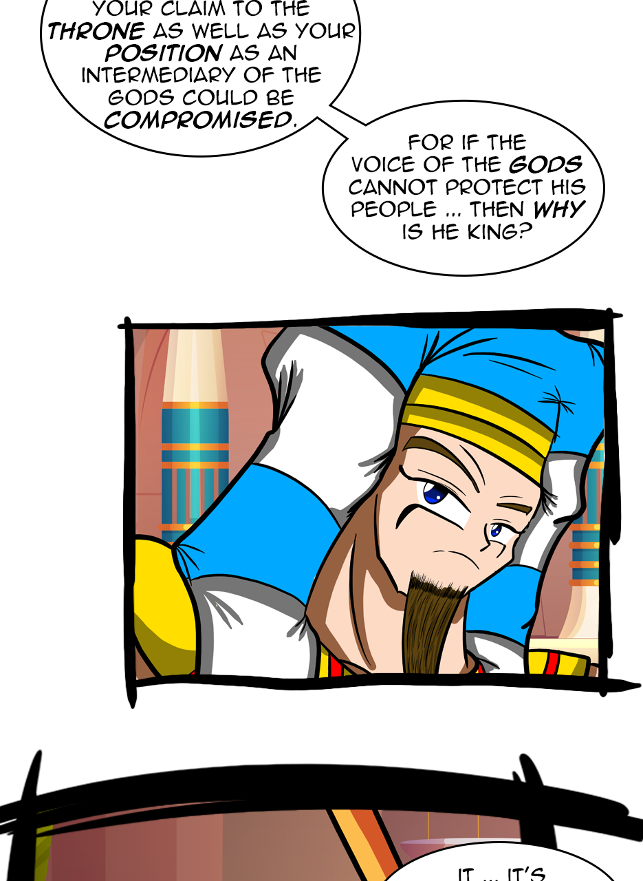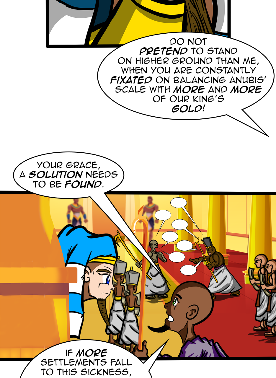I loved the fact that you made a ruler/a pharaoh as the hero/hunter. And WOW, he is not a tyrant! The way he pinched the bridge of his nose while listening to his ministers bickering gave me the impression that he is blessed with humility. He is either used to their argument but did not behead them, yet😅 - for some reason, or he is trying to think deeply of a solution. Anyways, he is good and blessed and protected by the gods. I loved the panels of the citizens and how he was concerned about them. I also appreciated the background music you chose for this episode. Well done! Bravo!