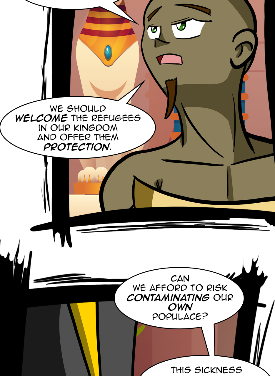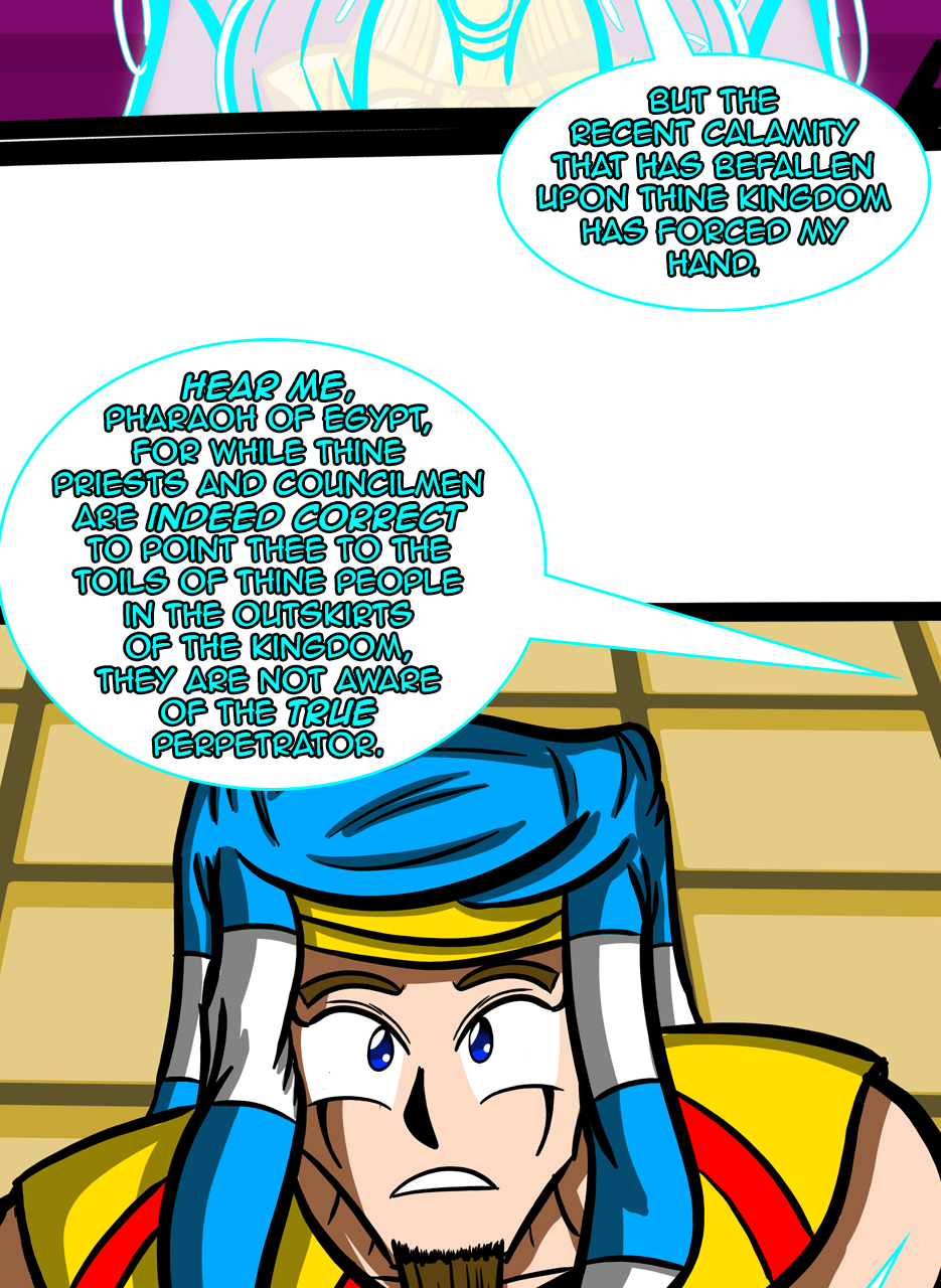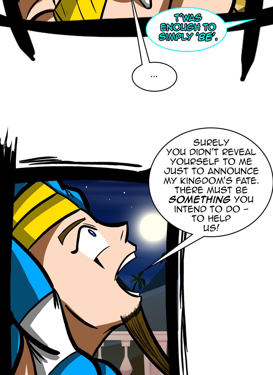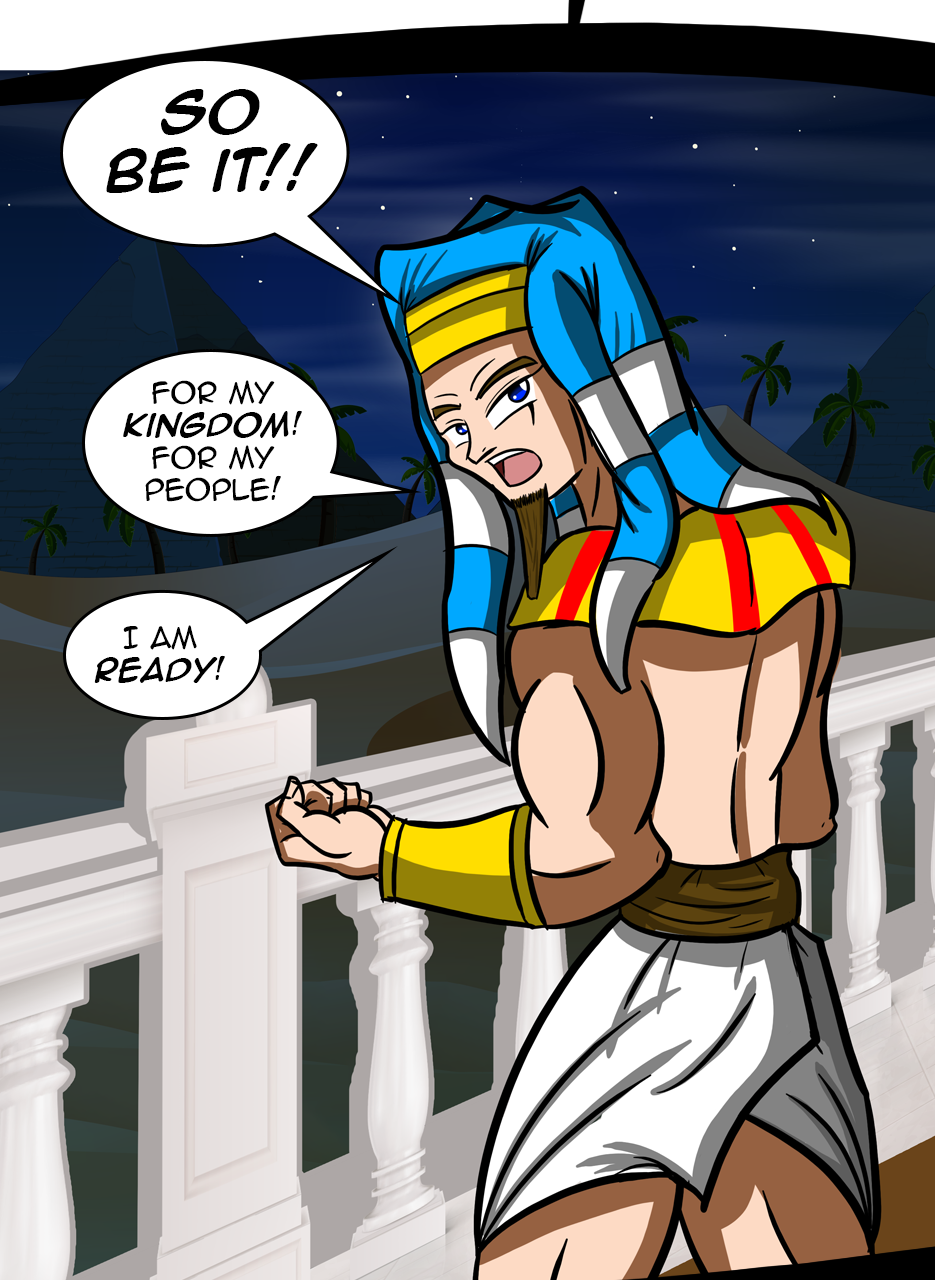 I loved the fact that you made a ruler/a pharaoh as the hero/hunter. And WOW, he is not a tyrant! The way he pinched the bridge of his nose while listening to his ministers bickering gave me the impression that he is blessed with humility. He is either used to their argument but did not behead them, yet😅 - for some reason, or he is trying to think deeply of a solution. Anyways, he is good and blessed and protected by the gods. I loved the panels of the citizens and how he was concerned about them. I also appreciated the background music you chose for this episode. Well done! Bravo!