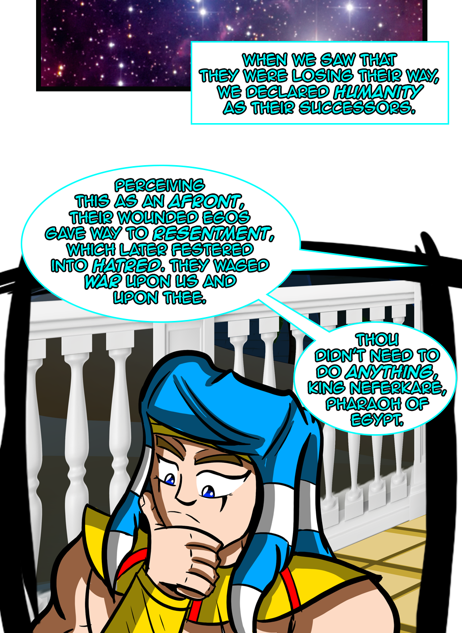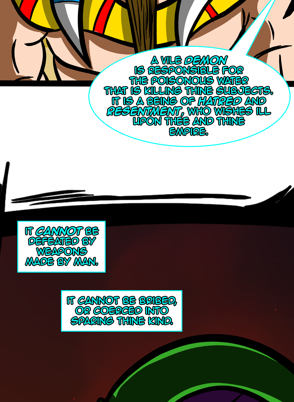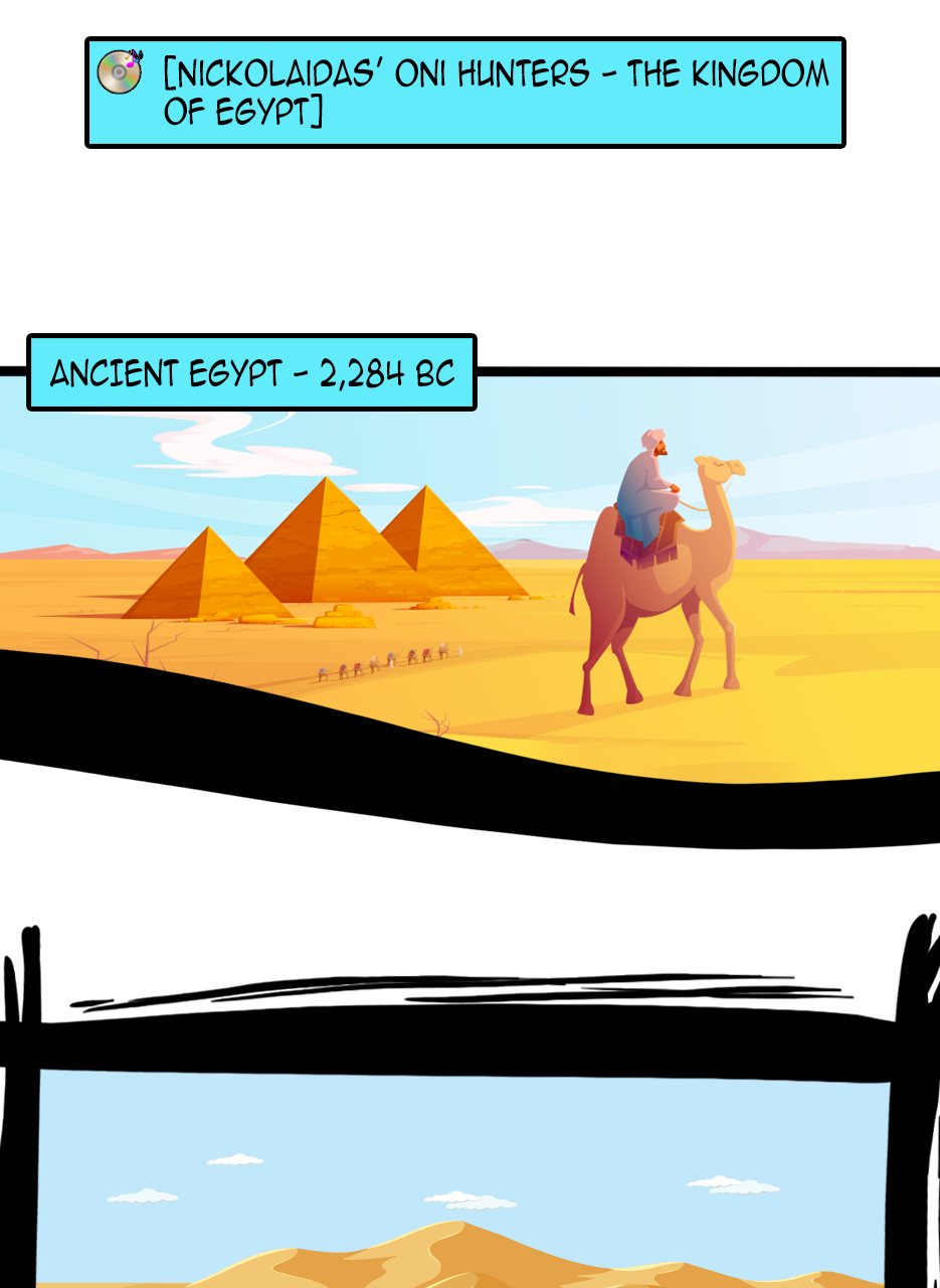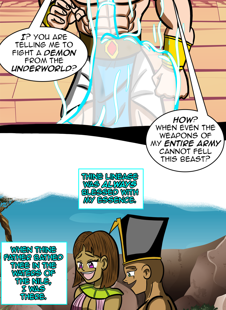 I loved the fact that you made a ruler/a pharaoh as the hero/hunter. And WOW, he is not a tyrant! The way he pinched the bridge of his nose while listening to his ministers bickering gave me the impression that he is blessed with humility. He is either used to their argument but did not behead them, yet😅 - for some reason, or he is trying to think deeply of a solution. Anyways, he is good and blessed and protected by the gods. I loved the panels of the citizens and how he was concerned about them. I also appreciated the background music you chose for this episode. Well done! Bravo!