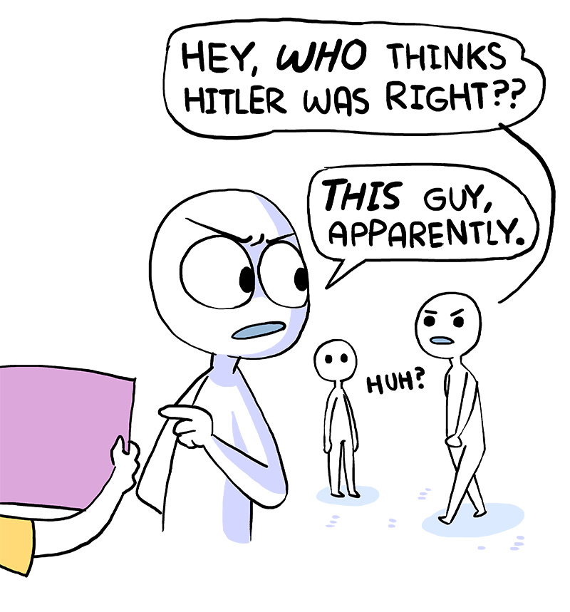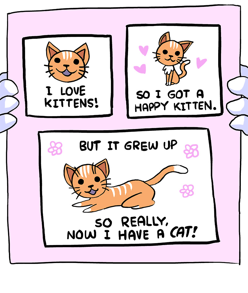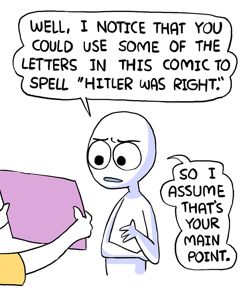 How many panels does this comic have? 7. And What does Shen say hes loves that has 7 letters?? Kittens. But in the last 3 part panel, what happened to that kitten? It became a CAT. And how may letters does CAT have?...3. STAY WITH ME. In the last panel. Shen is surrounded by THREE people(hands not included) while holding a comic with THREE panels and in that final panel has a cat. CAT. 1,2,3. NOW, please tell me what Shen draws on his face that ALWAYS has three sides...yes. his nose. It is always in the shape of a TRIANGLE... LADIES AND GENTLEMEN, WITH ALL THESE OBVIOUS CLUES REVEALED, I CAN NOW TELL YOU HIS SECRET... Shen is racist because he only draws white characters. that is all.