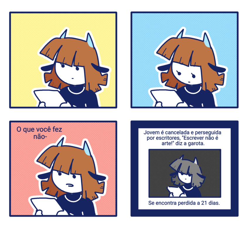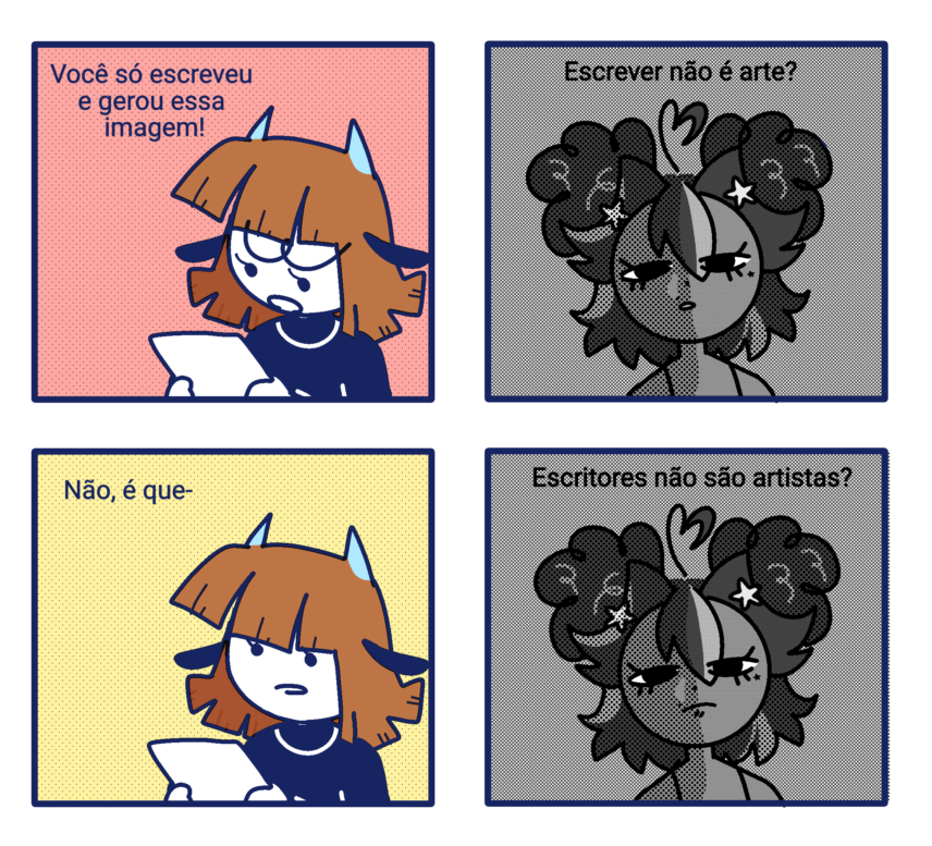 OBS: a tirinha foi feita apenas para gerar entretenimento, tudo escrito não é minha opinião sobre(e eu não apoio arte IA). Personagem da esquerda pertence à uma amiga, @kiki_neners no Twitter.