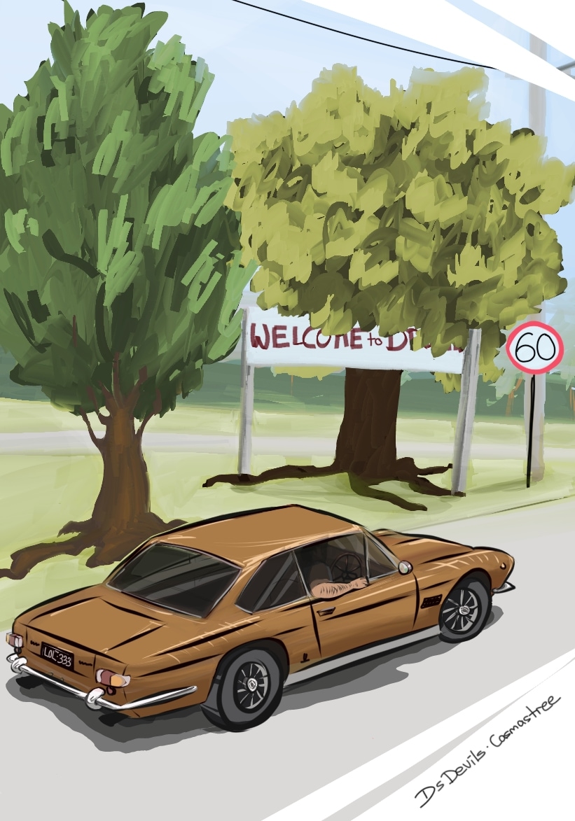 We're passing through a small town near Melbourne, Australia. It's 1972. They take a more hands-off approach to pruning round these parts