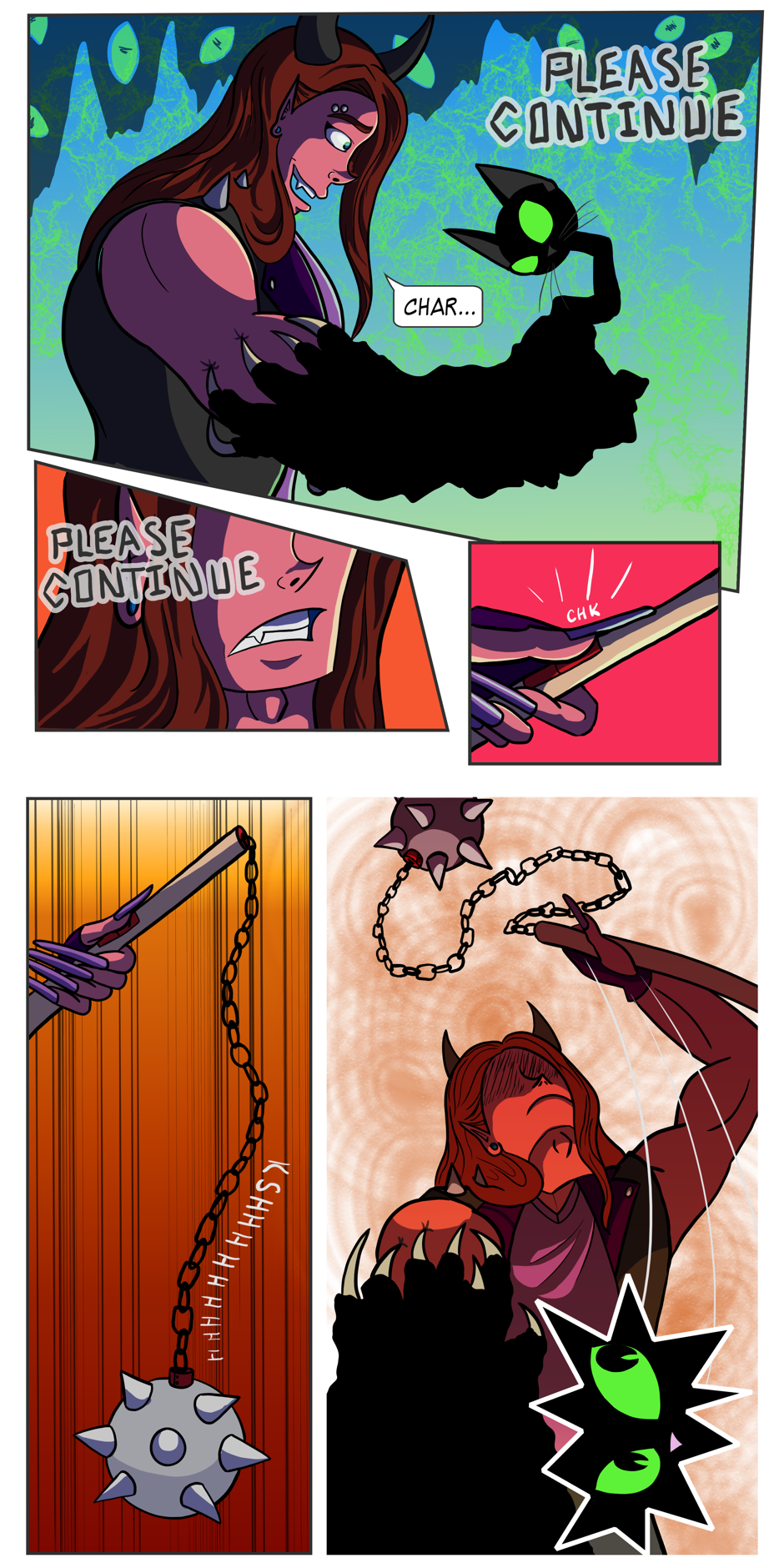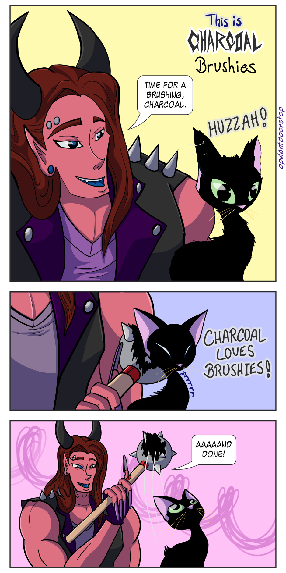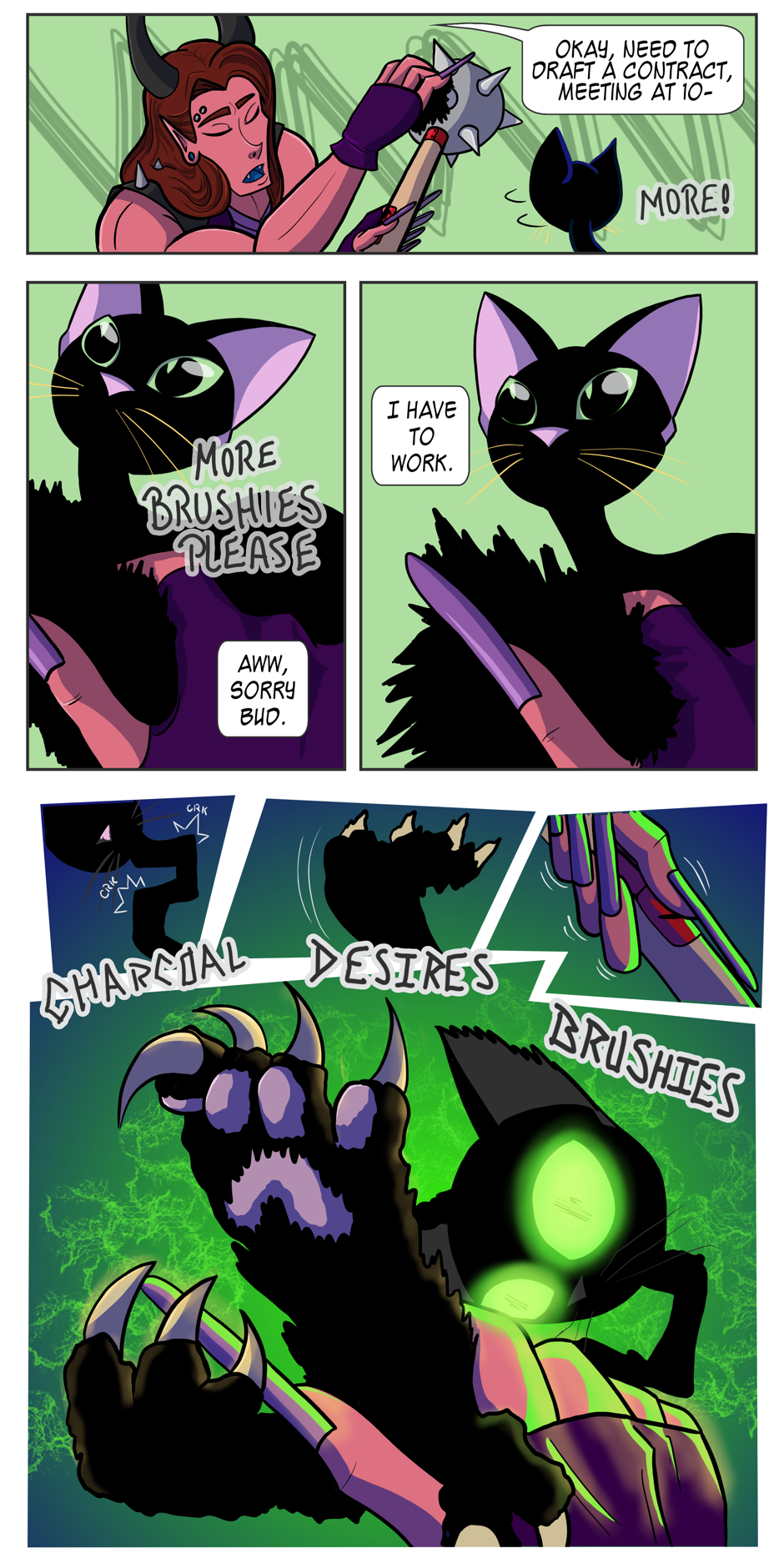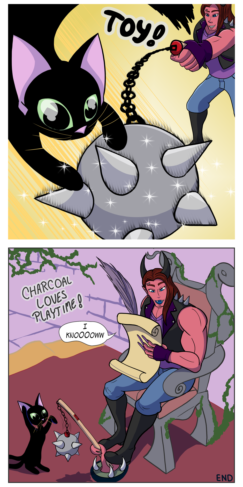 Bear witness to pet ownership on a cosmic level as Charcoal brings home man-sized snakes, summons gods to give him treats, and naps in the laps of Titans. Wherever head goes, cat goes, and sometimes cat goes to space. Don't get upset Satan; Charcoal's just being a kitty.