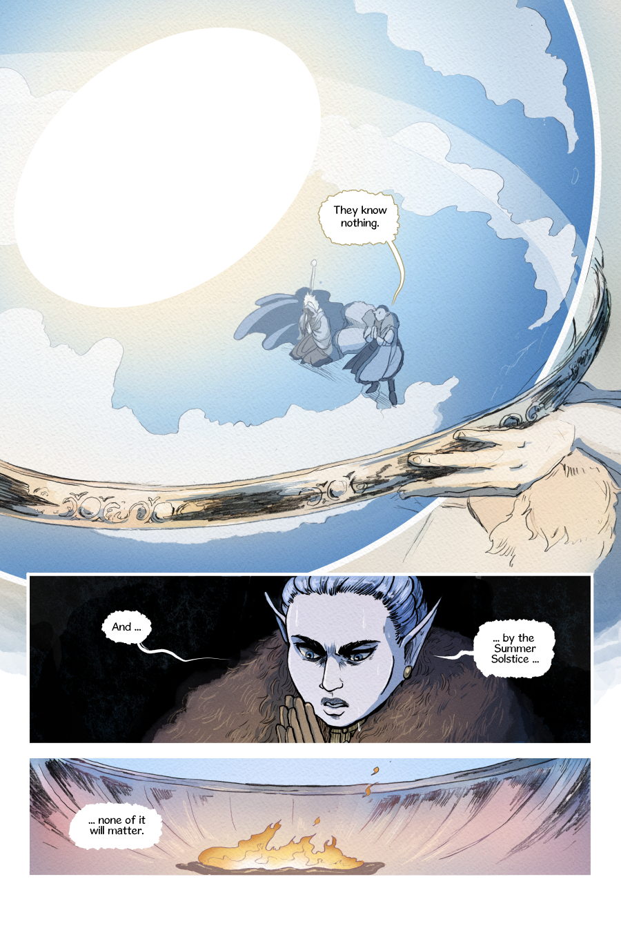At the peak of the world lies Svalverfi, a city veiled in eternal winter. The queen's holy fire keeps it from ruin, but as she grows weaker, so does the flame. Who will succeed her before it's too late? The troubled princess Ragnhild or the decadent prince Heidrek? So begins a family feud that will decide everyone's fate. In the midst stands Ismund: a newcomer who, like the throne, is torn between sister and brother. Empyrean is a queer court-drama in a society with reversed gender roles