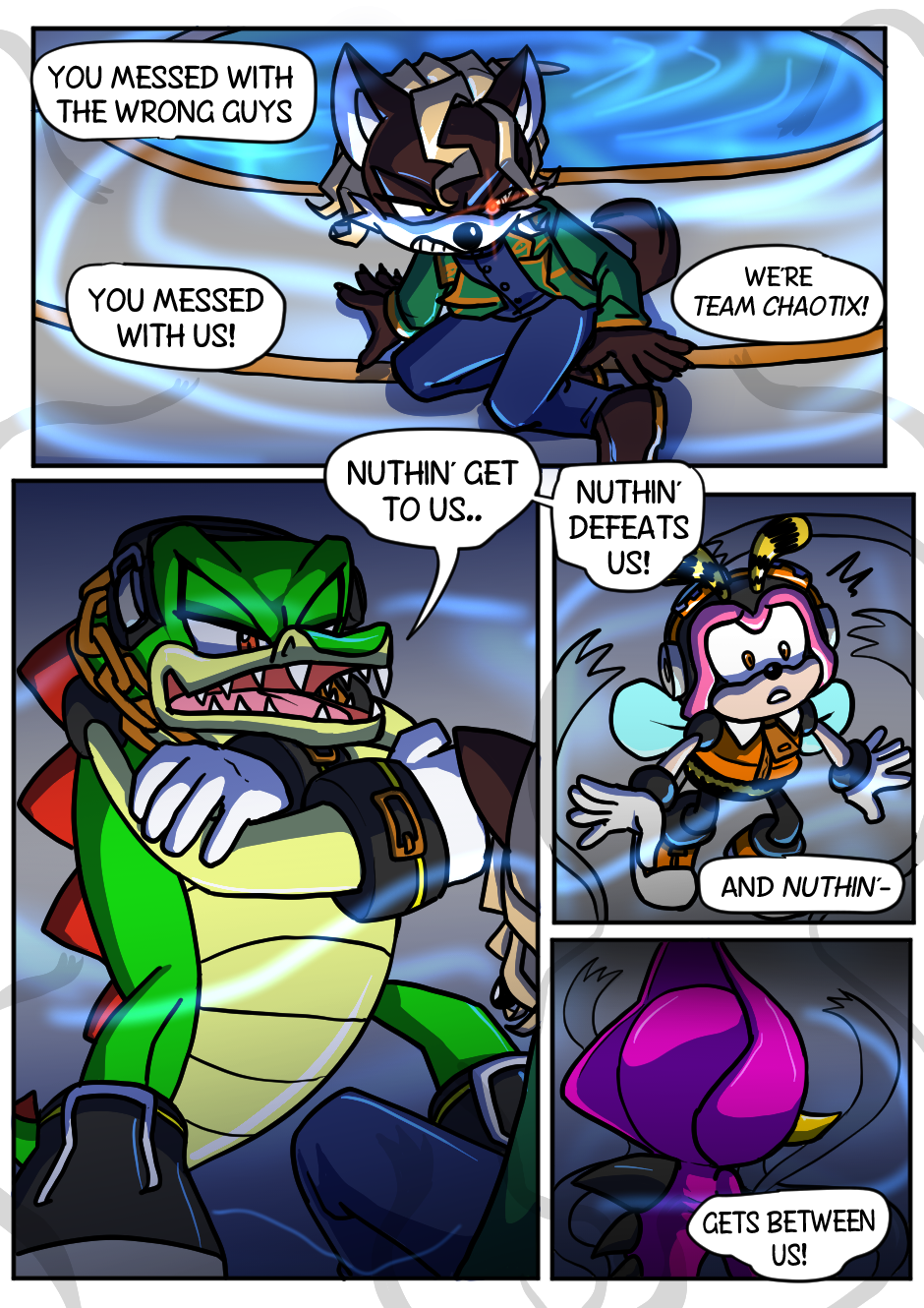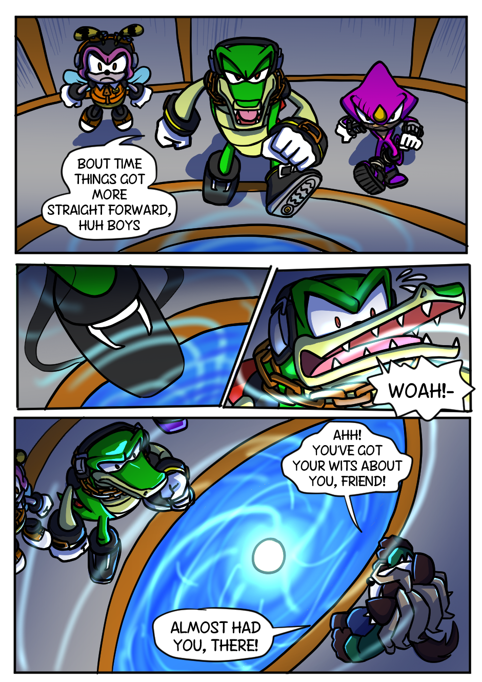 Solving crimes and getting to the bottom of the mysteries is the least of these guy's problems, but don't forget, they're Team Chaotix- Nothing comes between Vector, Charmy and Espio!