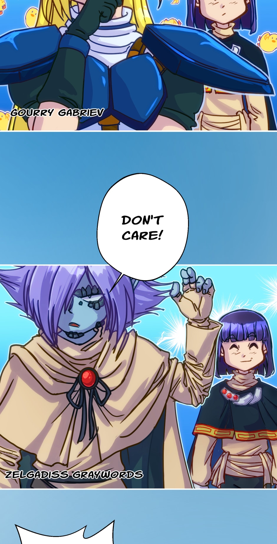Filia : She is a Golden Dragon and their ex-priestess ( she disagreed with their extremism and way of doing things) . She is a Ryuzoku disciple ( holy power) Xellos is her sworn ennemy but in Slayers Try, they had to travel and fight side by side to save the world .( Demons don't want the world to be destroyed by others than themselves )