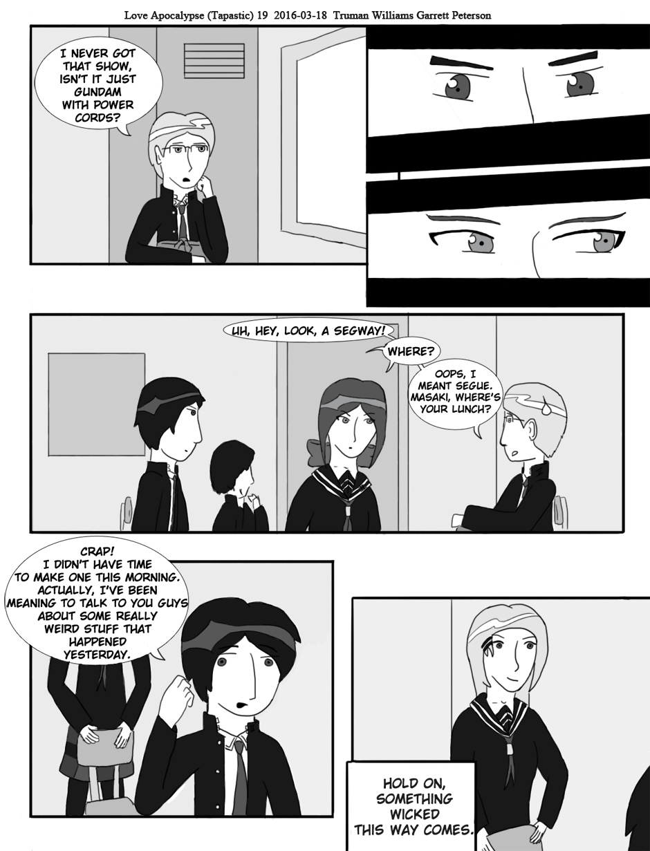 This is the first comic that I worked on, mainly doing the art while Truman wrote it. It released on Smackjeeves as [T&G’s] Love Apocalypse from May 7th 2013 to August 9th 2015, totaling in 63 pages, plus extras. The first page is being released on the main character’s birthday: February 28th.