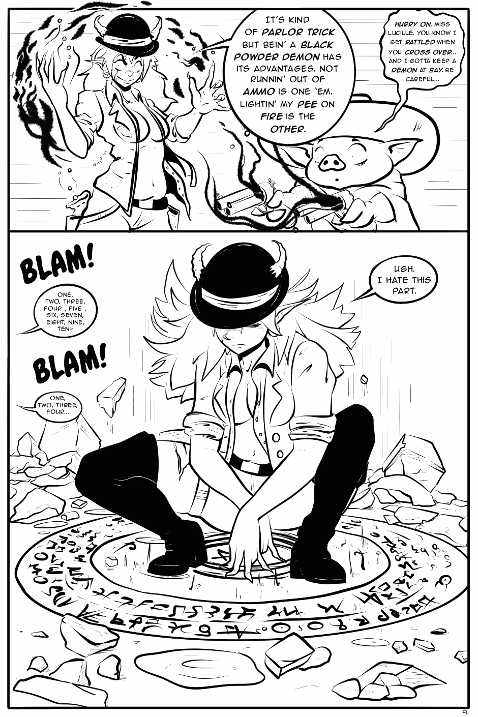 Tarnation Lucille is a half-demon, half-mortal gunslinger who blasts her way through the wild and weird west with her loyal , albeit timid, pig sidekick, Shatso and the power of black powder. No challenge is too big, too petty or too bizarre, as they face off against mutants and monsters, bandits and banshees. Each chapter is an individual thrilling and humorous stand alone adventure that reveals more of Lucille's gun slinger skills, dark birthright and inner conflict, as she tries to find her place in a world that rejects both her demonic and human sides. Inspired by the early 90s manga era, “Tarnation Lucille” is a homage to the works of Akira Toriyama and Johji Manabe (Caravan Kidd, Outlanders) with a twist of humor, horror, fantasy and a little of “The Good, The Bad and The Ugly” thrown in. In this first adventure, Lucille and Shatso stumble across a desert spring town with a terrifying secret.