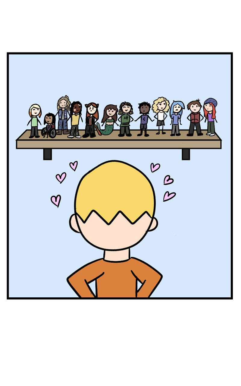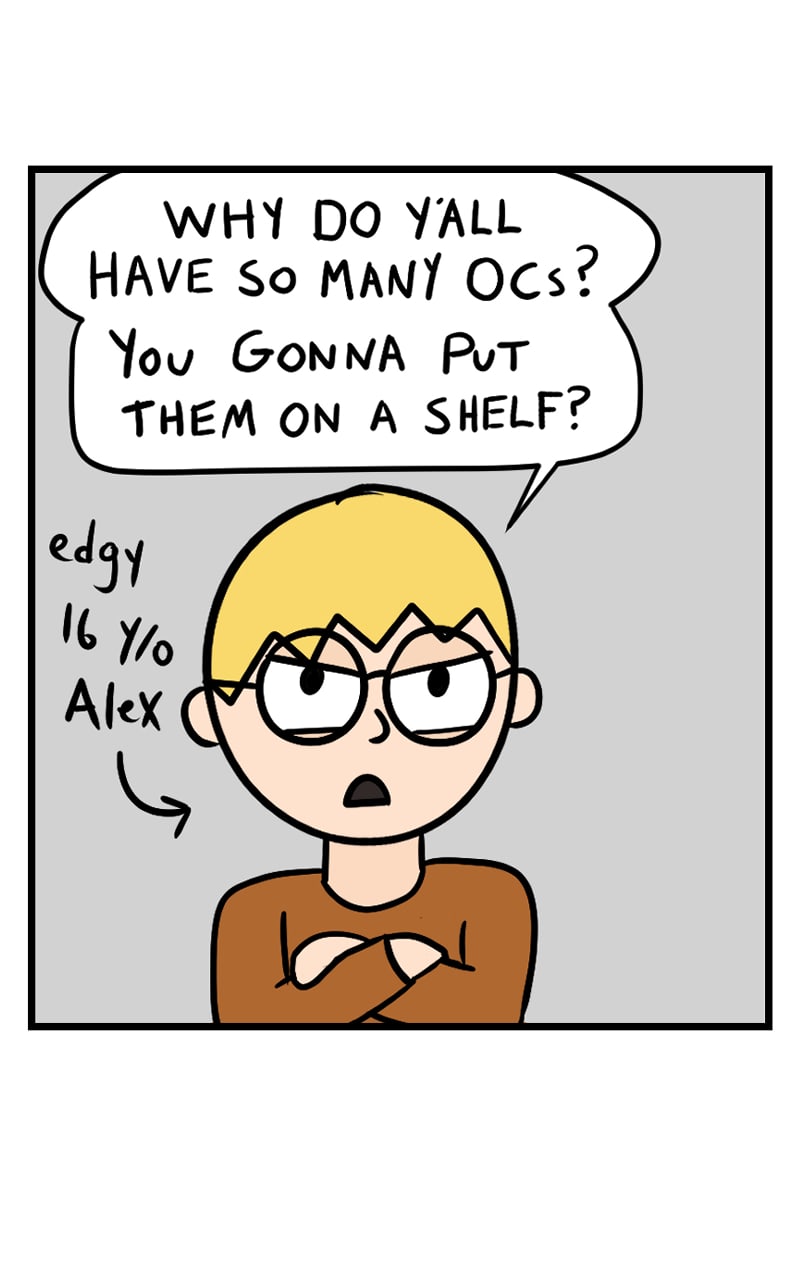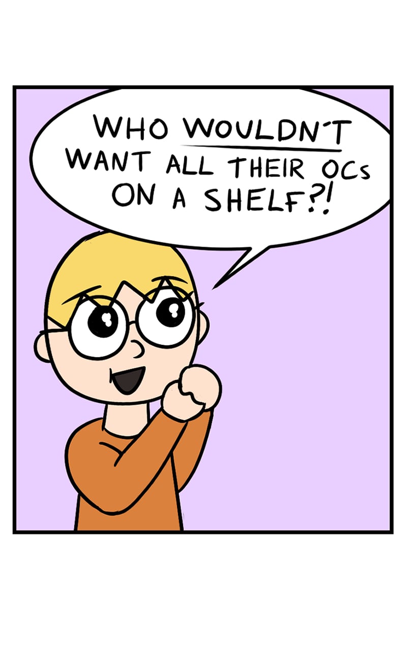 I remember disliking the fact people made characters just for the sake of making characters. “You got the put them in a story, because what else are you going to do with them? Put them on a shelf and let them collect dust?” Now I’m like, yes, absolutely. I would love that.