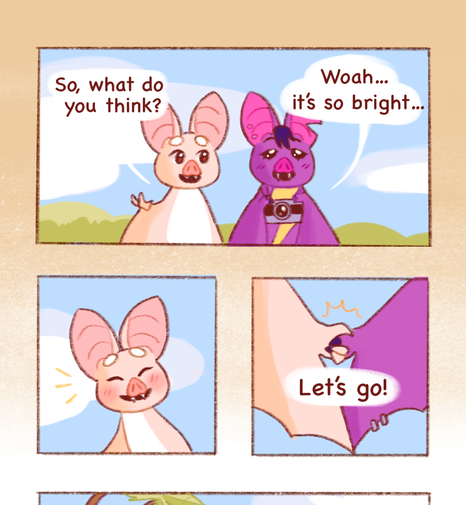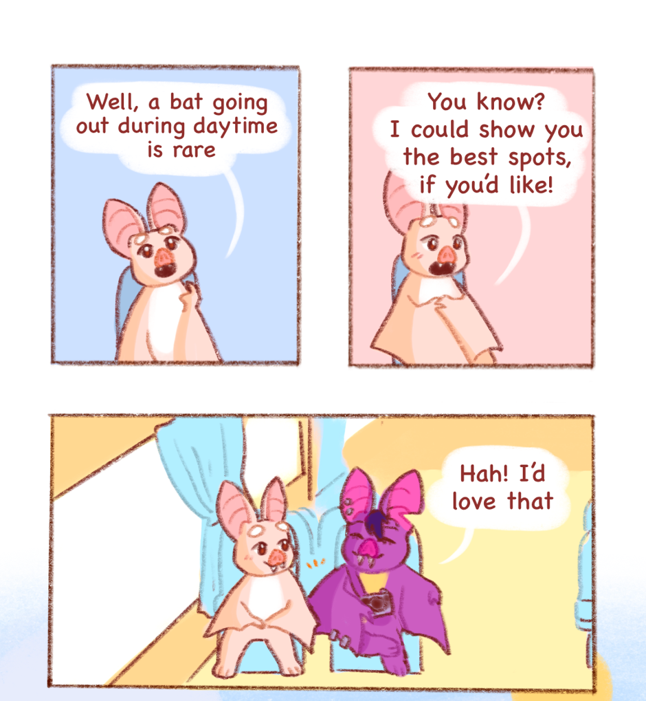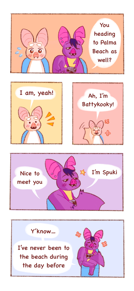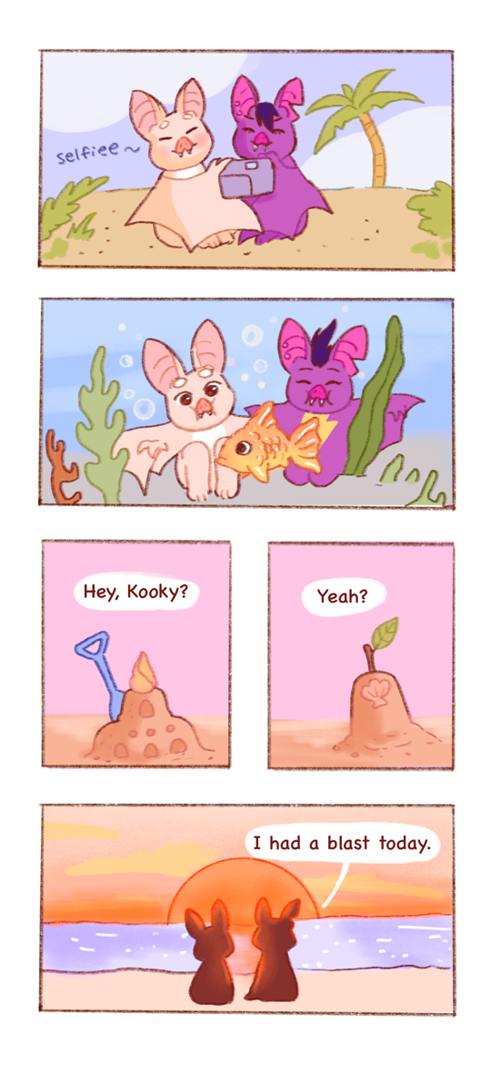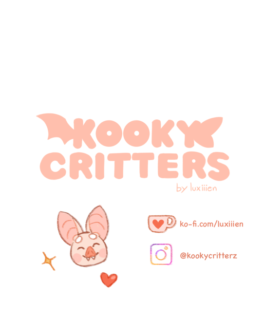 Kooky Critters is a cozy comic that follows the life of Kooky the bat and their unusual friends. Tag along with unconventionally cute critters and enjoy their adventures around Garden Town!