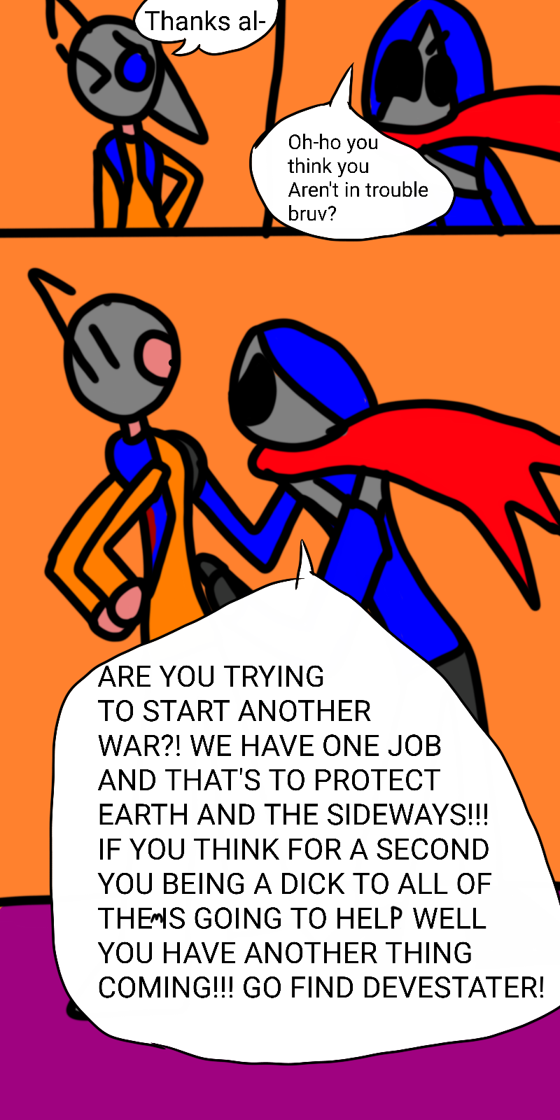 Pangea reformed.. other worldly creatures emerge to reek havoc.. or well, exleast thats what people use to think. Made by OneGloved, The Sideways war is a story about the TORIN, a legendary "criminal" wanted by the current government voltec, as they amd there robot companion, KLANK wonder looking for allies in the rough, they will need all the help they can get, from a tribe of crazies, to a pair of bounty hunters, you never know where youre friends will lie in this wasteland...