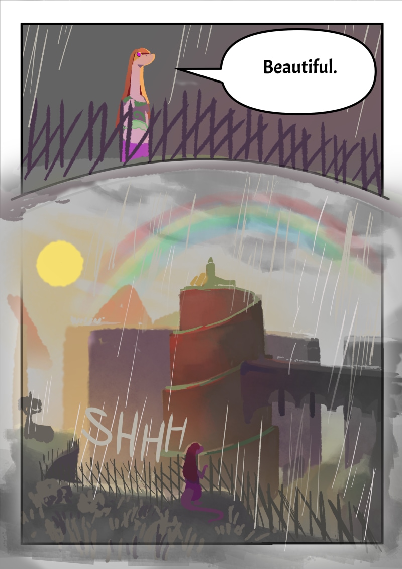 Everything is beautiful with the sunset and rainbow.