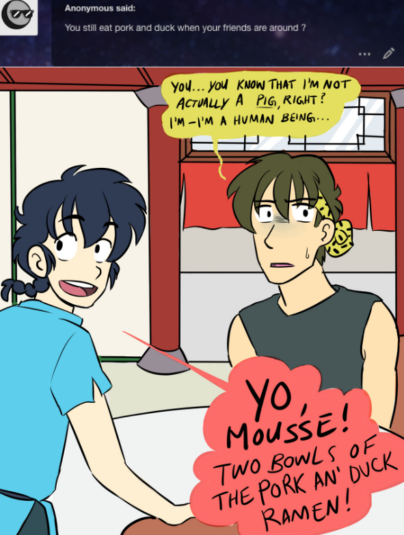 A Ranma 1/2 ask blog/webcomic where the plot is driven by your questions! Join the boys as they battle through the zaniness of everyday life as teenage martial artists—dealing with monsters, magic (anons), and a few awkward attempts at romance. Updates Sundays!