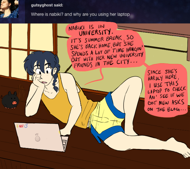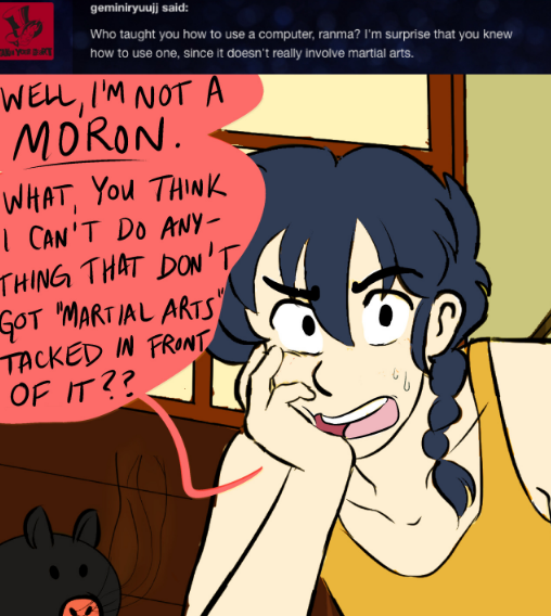 A Ranma 1/2 ask blog/webcomic where the plot is driven by your questions! Join the boys as they battle through the zaniness of everyday life as teenage martial artists—dealing with monsters, magic (anons), and a few awkward attempts at romance. Updates Sundays!