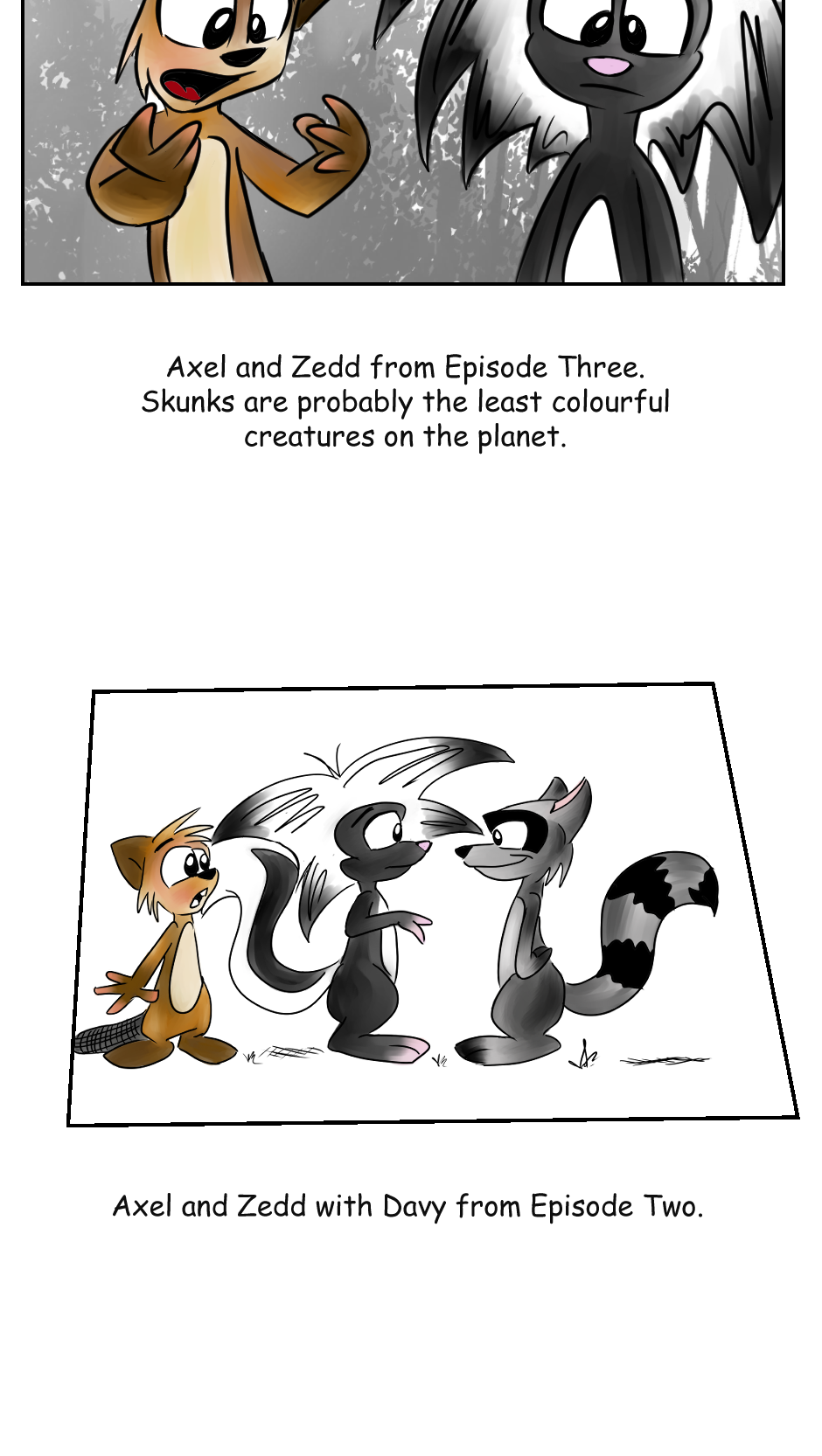 It's there he meets Zedd, a skunk in self-imposed exile for his own 'freakiness', who identifies with Axel's feelings and will introduce him to other critters with their own reasons for leaving their own kind.