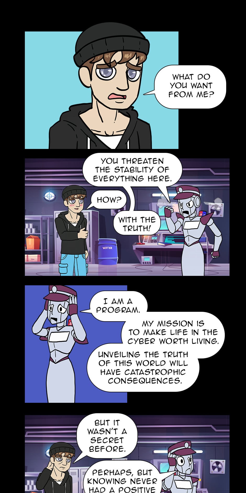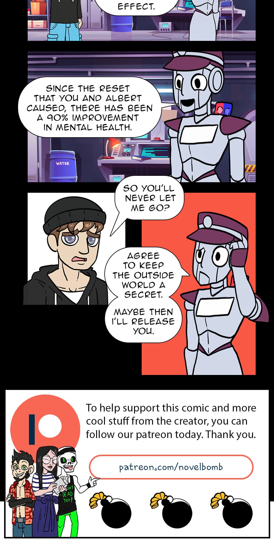 Earth's last remaining survivors were on a long voyage through space to a new home. Most of the population went into cryogenic pods. To keep everyone's brains active, they were introduced to a virtual world formed by the shared minds of those inside. However, Someone had to maintain the system. New pages each Monday. You can follow us on Patreon to access pages a week before everyone else.