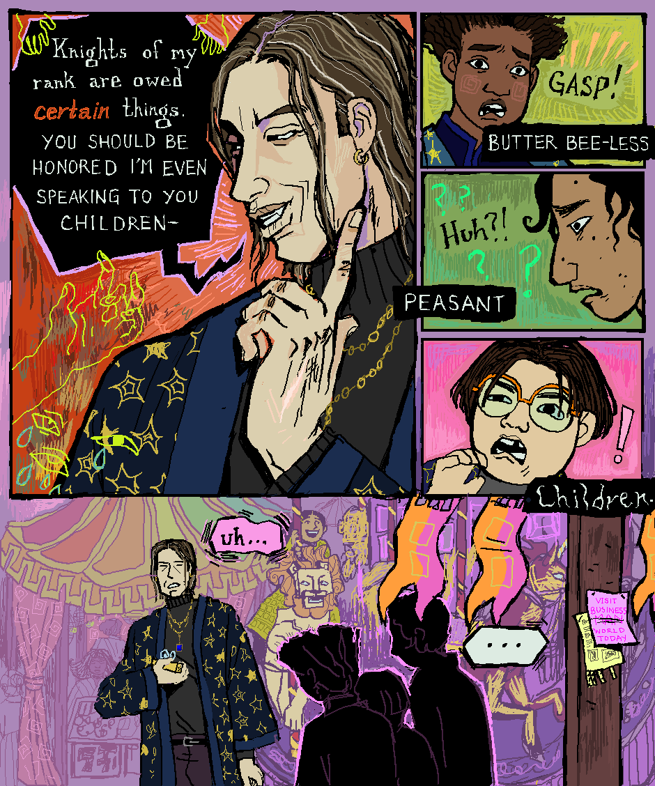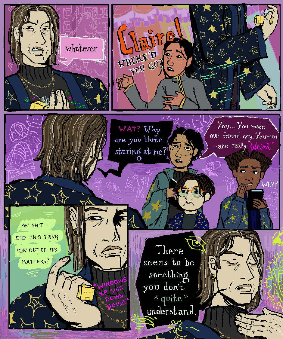 Oh, we ARE back with more chapter??? More plot, more scary, more oh no??? YES! Claire is no where to be seen unfortunately but she WILL be okay, it's just off screen <3 Meanwhile the kiddo still have to deal with That Guy (TM) ... damn I really drew him saying the weirdest shit ....