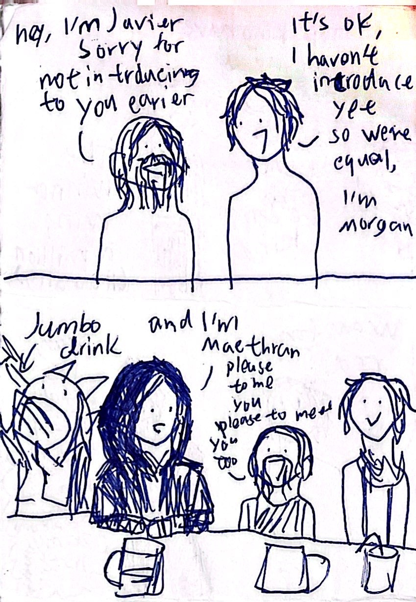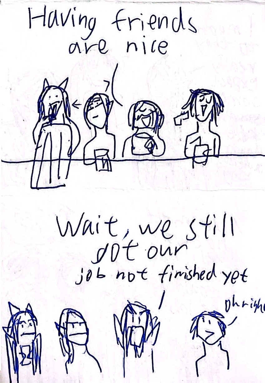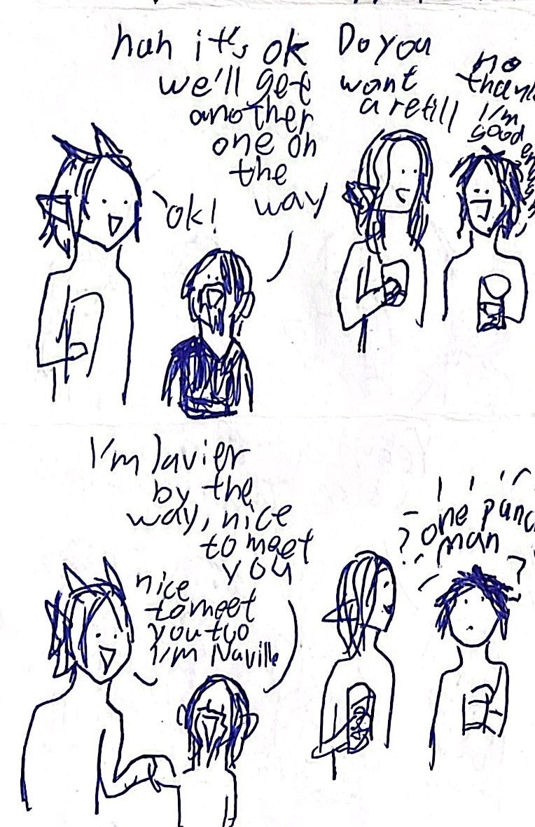 He met Maethran (elf), Naville (dragon faerie), and Javier (dwarf). And later on they became a team to win the contest and basically try to survive in this world.