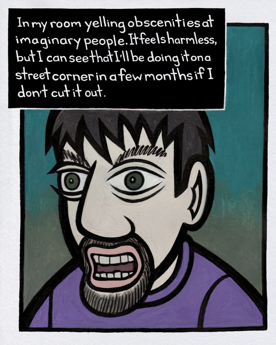 In my room yelling obscenities at imaginary people. It feels harmless, but I can see that I'll be doing it on a street corner in a few months if I don't cut it out.