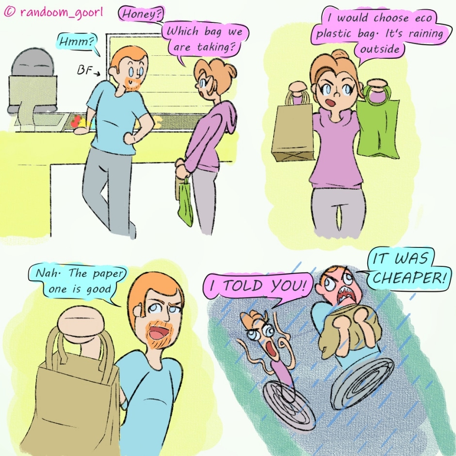 Or get one of those Totebag ? Is sturdy enough to carry some of the heavier groceries AND for some added bonuses that its reusable , and some time the bag itself have these little pictures like " Awh look this one has Cute kitties , AH that one have Cute Puppers ! Whoooo that one have Both ! "