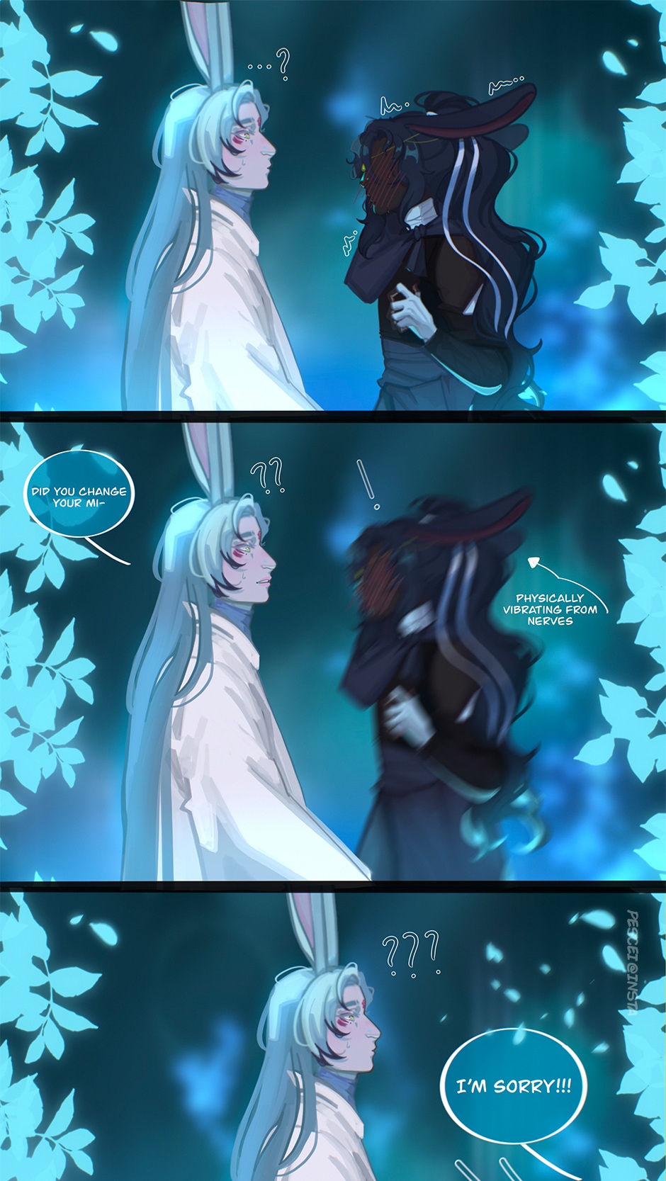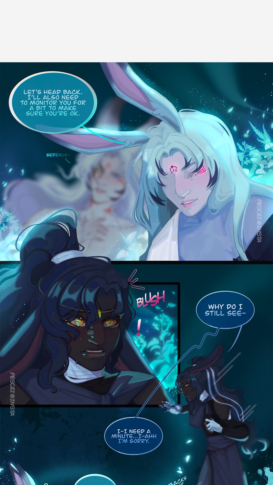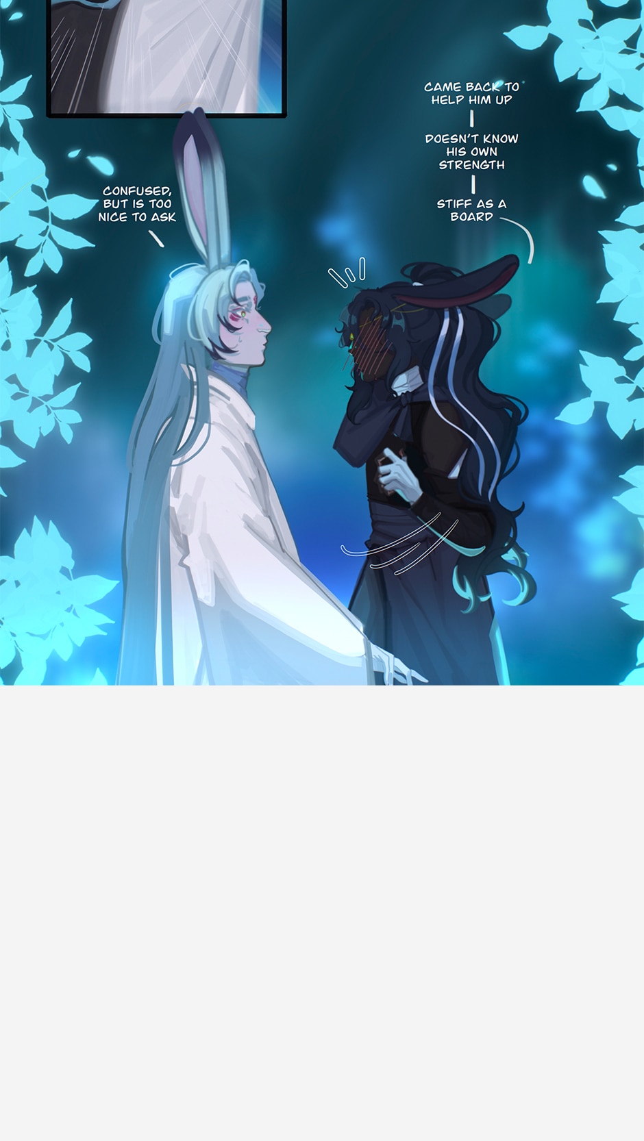 This is a more experimental short webcomic for me to flesh out my characters for when I begin planning the main webcomic! This short comic, and it's events, do happen in the main story, however! Meet Desiderius (white haired bunny) and Serenus (black haired bunny). In this short BL comic, Serenus struggles to find his words and emotions after Desiderius being in recovery for 2 years outside of their village. Serenus has always withheld his feeling for Desiderius even as a small bun. Now his feelings threaten to spill due to outside forces. I do not want to say much as this is a short to a bigger in the process story I will release in later time. Thank you for reading!