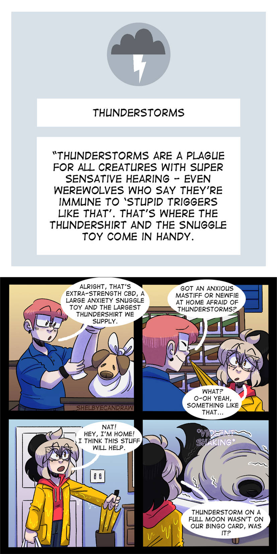 My dog isn't anxious about thunderstorms (I dont actually know that we live in the driest place on earth so maybe he actually is) but the idea of Nat being anxious about them whenever they happen on the Full Moon is endlessly amusing, especially when you have to think about how big that thunder shirt has to be.