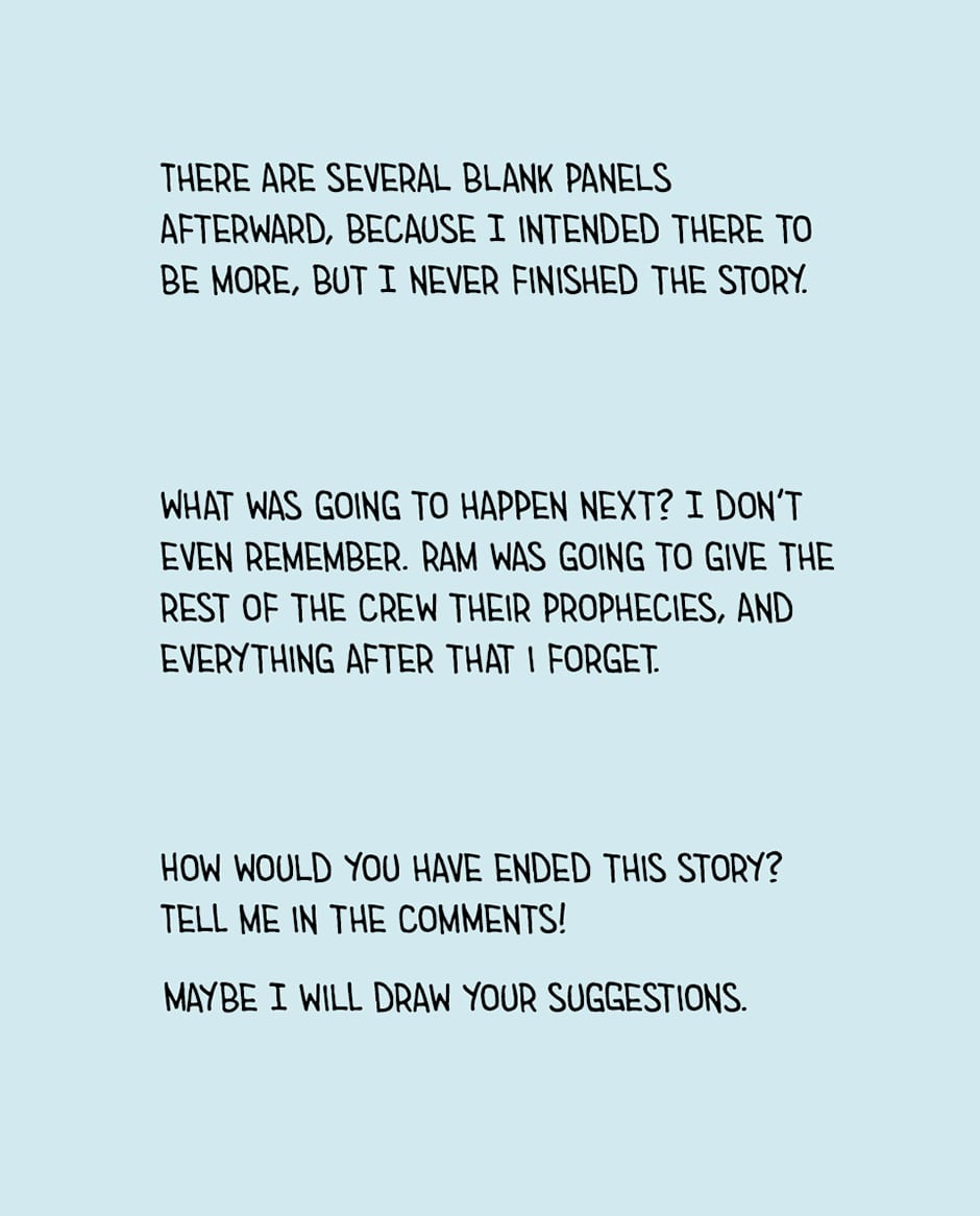 I don't know! But if you come up with any good ending ideas, I might draw them.