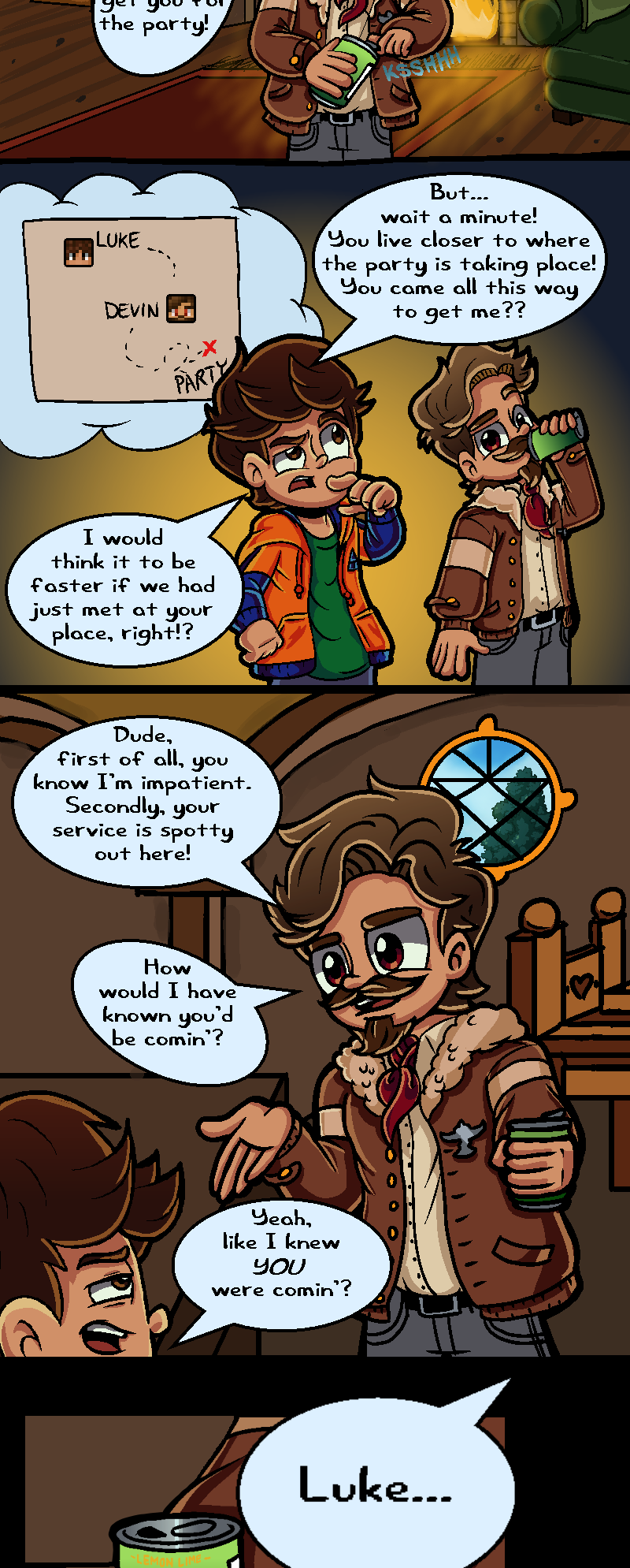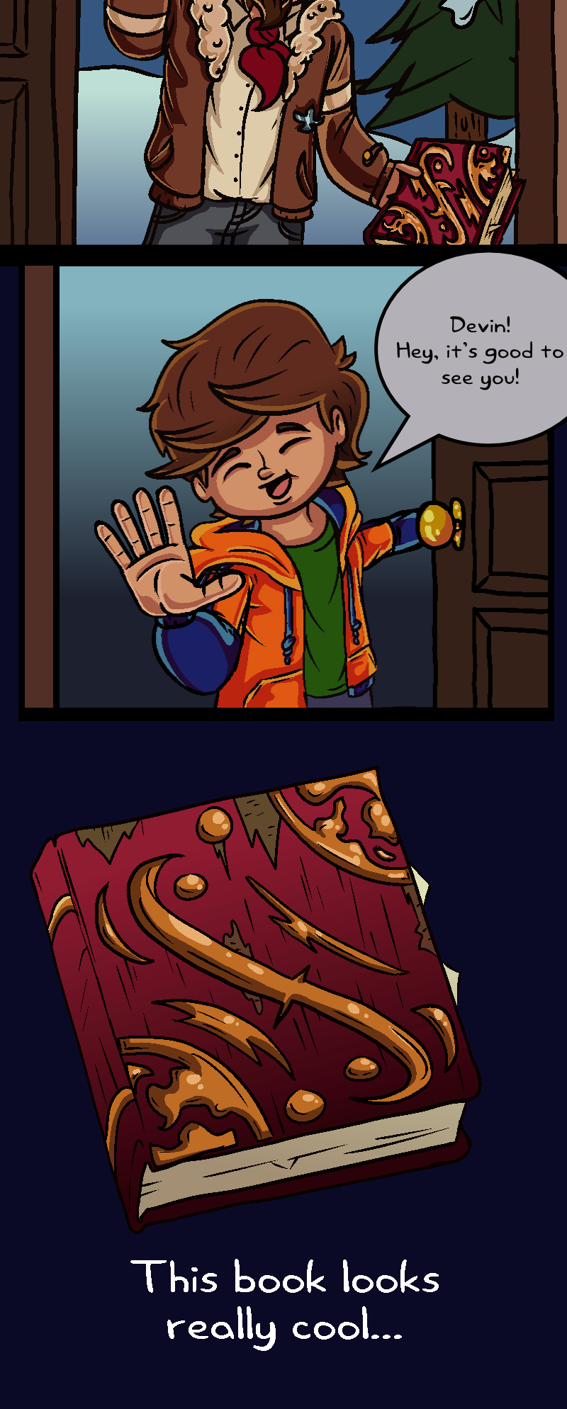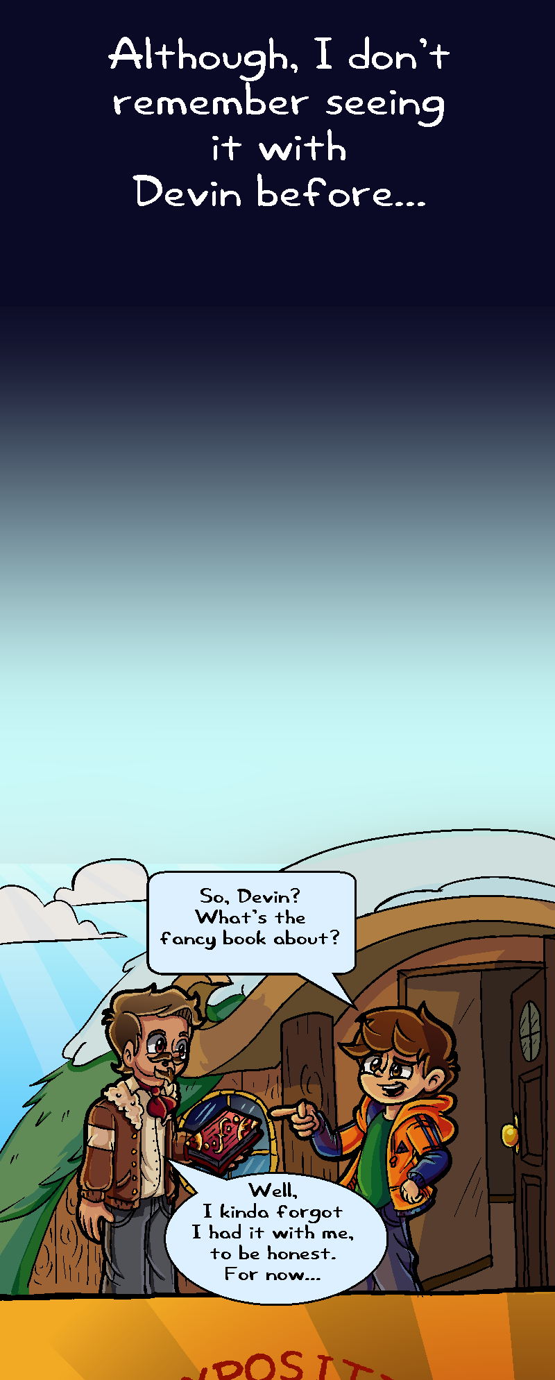 When Luke askes about the mysterious book Devin has, Devin puts it away in his coat-liner and says he'll talk about it later. Likely, he means he will talk about it after the group goes to visit Psyberus for his "birthday!"