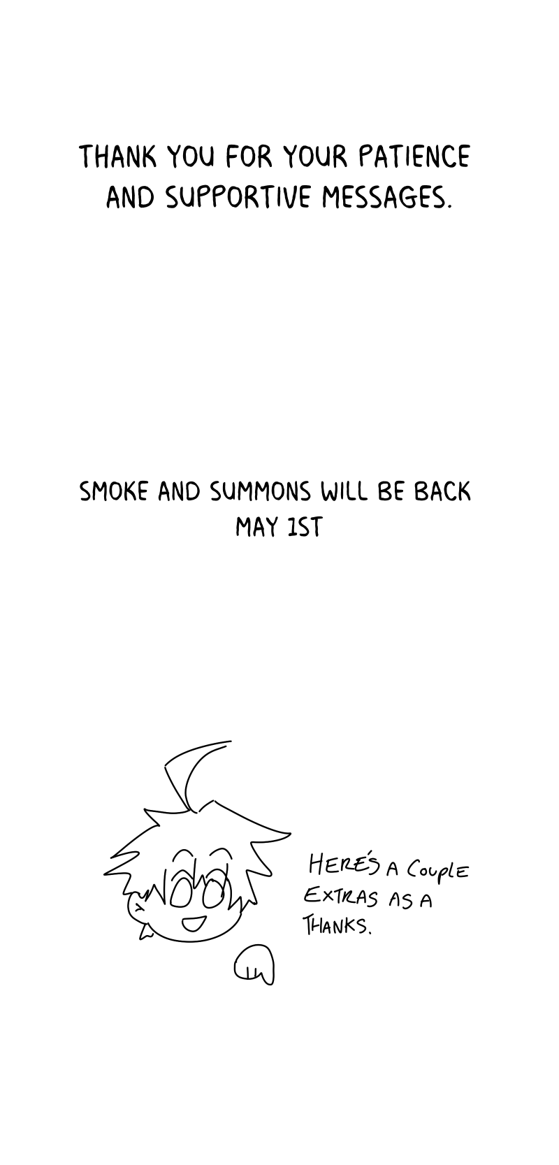 As i mentioned above, Smoke and summons will be back MAY 1ST!!!. thank you for waiting on my slow ass drawing speed. :))))