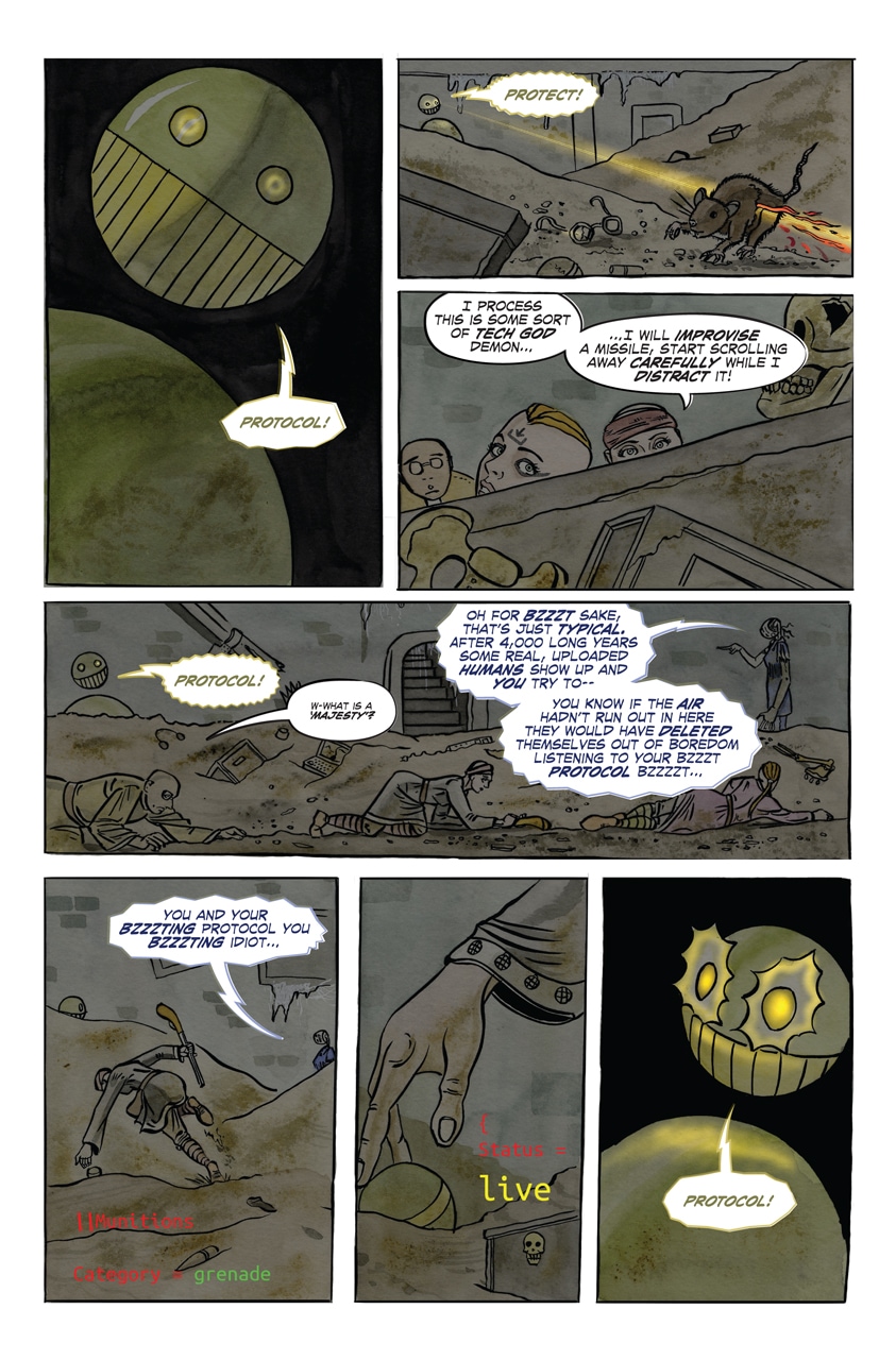Ethel has been stuck underground in the fallout shelter for thousands of years. But she wasn’t alone - the former occupants also brought down a programmed sentinel before closing the blast doors. The odd couple were stuck with each other when the air and water ran out and the dust buried the rat-gnawed bones of the government. Warrior will attempt a diversion - with an improvised missile that will later prove significant.