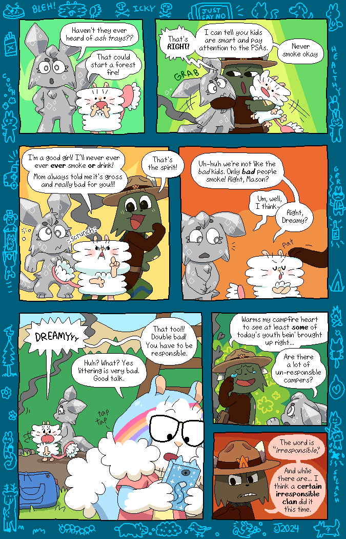 Most of the character designs were bought (adopted) from children on DeviantArt, resulting in a colorful cast of cats and dogs! The comic was made to be a love-letter to the creative minds of these kids. Credits to the original designers will be in the page description as they appear. The comic is all-ages.